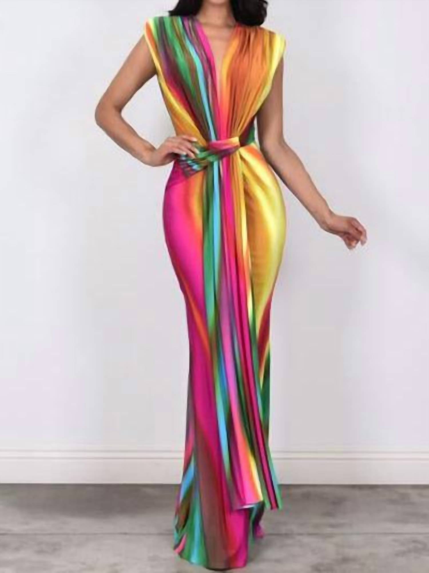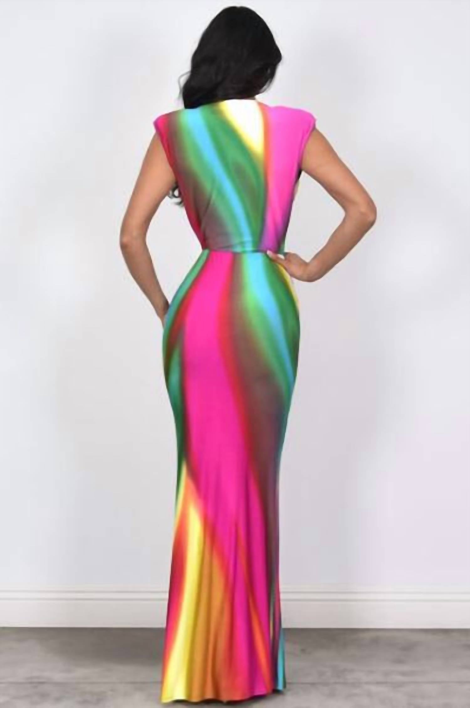 A maxi dress that is just as cute as it is comfortable. Introducing the Cameo Swirl Print Dress, a stunning addition to your wardrobe with its vibrant multi-color rainbow pattern. This sleeveless maxi dress is designed in a mermaid style and crafted from a medium-weight poly-spandex blend, ensuring a perfect fit that hugs every curve. With its plunging V-neckline and ruching detail, it offers a figure-flattering silhouette that’s ideal for a dinner party or special occasion. Embrace the maximalist trend this fall with this eye-catching sheath dress.