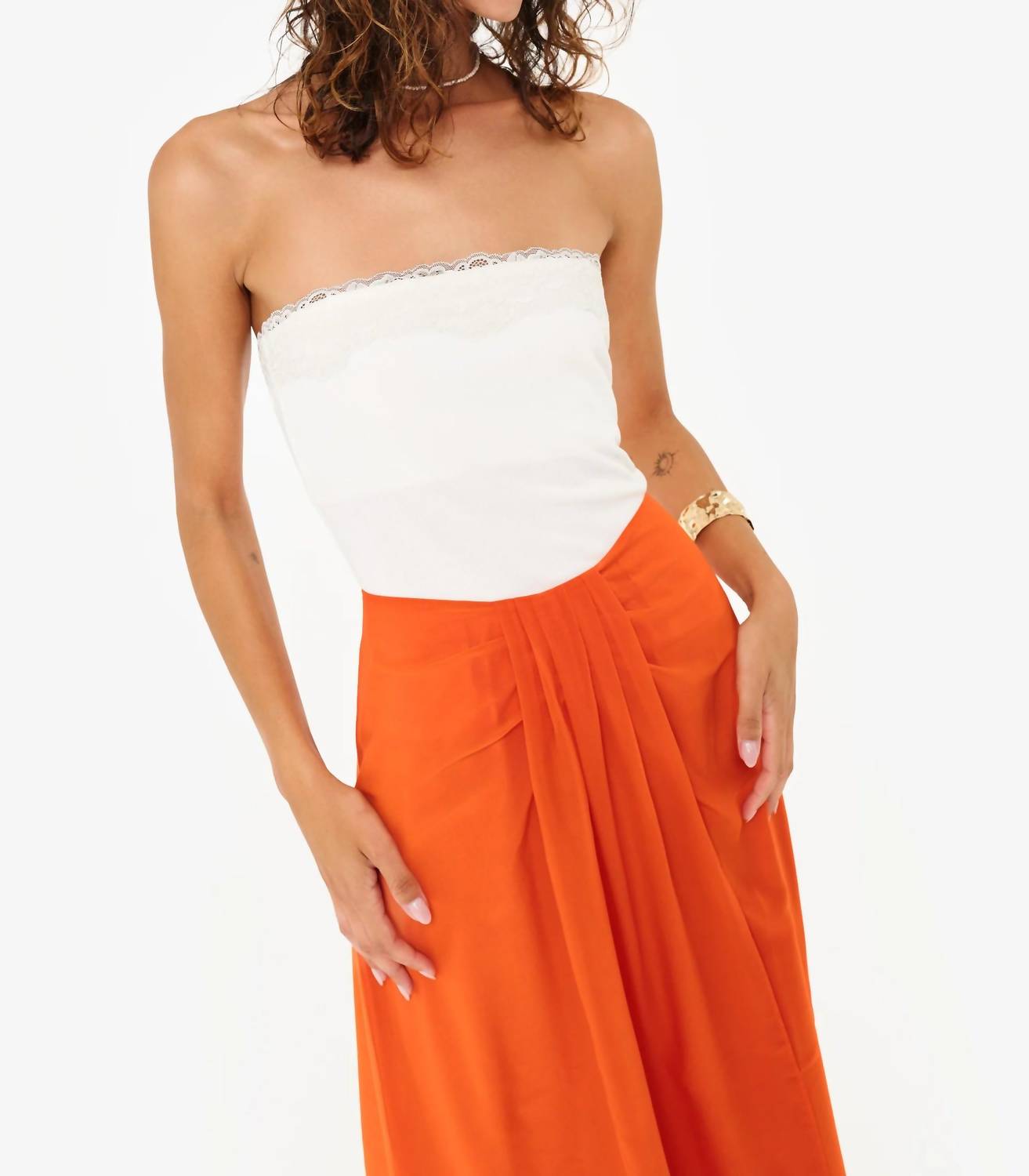 Flowy, comortable and stylish. This maxi skirt is a fan favorite. Introducing the Bahia Chiffon Skirt by Cami NYC, a stunning piece in vibrant clementine that brings effortless beauty to any occasion. Made from 100% polyester poly chiffon, this mid-rise maxi skirt features an angled waist with a front panel for a sarong illusion and an invisible zip closure at the center back. Fully lined for added comfort, its soft pleating enhances the flowy silhouette. Care for this beautiful piece with dry cleaning.