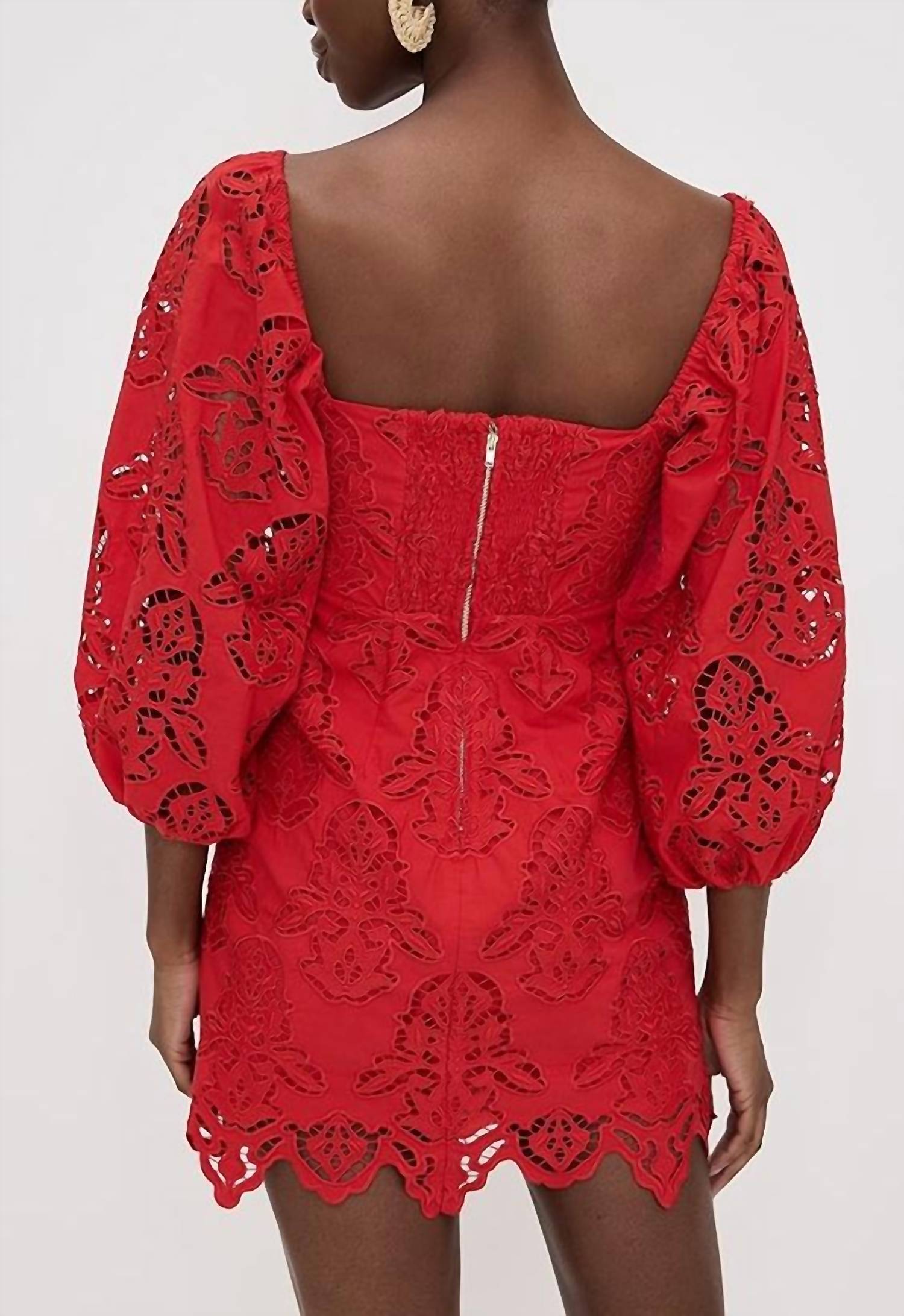A short and breezy dress for those warmer days. The Montauk Mini Dress by Cara Cara in Red Embroidered Eyelet fabric is a chic addition to any spring wardrobe. Crafted from 100% cotton, this patterned mini dress features a square neckline and blouson three-quarter sleeves, accentuating the sheath silhouette. It includes a back body smocking panel and darts for a fitted shape, while the center-back zipper with a hook-and-eye closure ensures a secure fit. Care for this garment by hand washing or opting for dry cleaning.