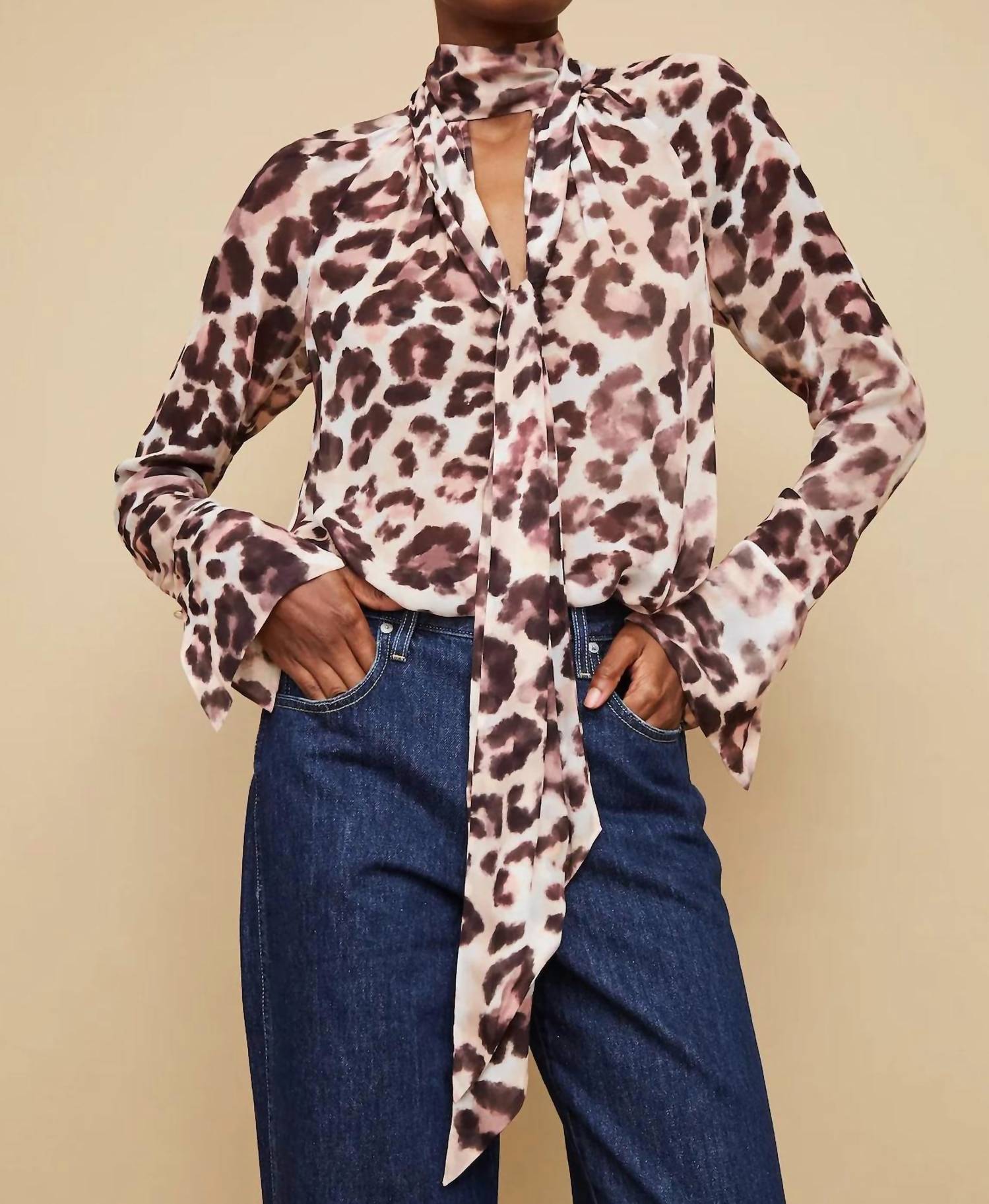 A versatile blouse that works from desk to dinner! Experience the elegance of Cara Cara with the Sundance Top, featuring a striking abstract cheetah ivory print. This blouse is designed with a mock neck and a self-tie detail, along with long raglan sleeves and fluted cuffs complete with button closures. Made from 100% viscose, it boasts a deep V cutout at the front secured by a hook-and-eye closure and a back keyhole opening with a button closure. Care for this sophisticated piece with dry cleaning to maintain its chic appeal.