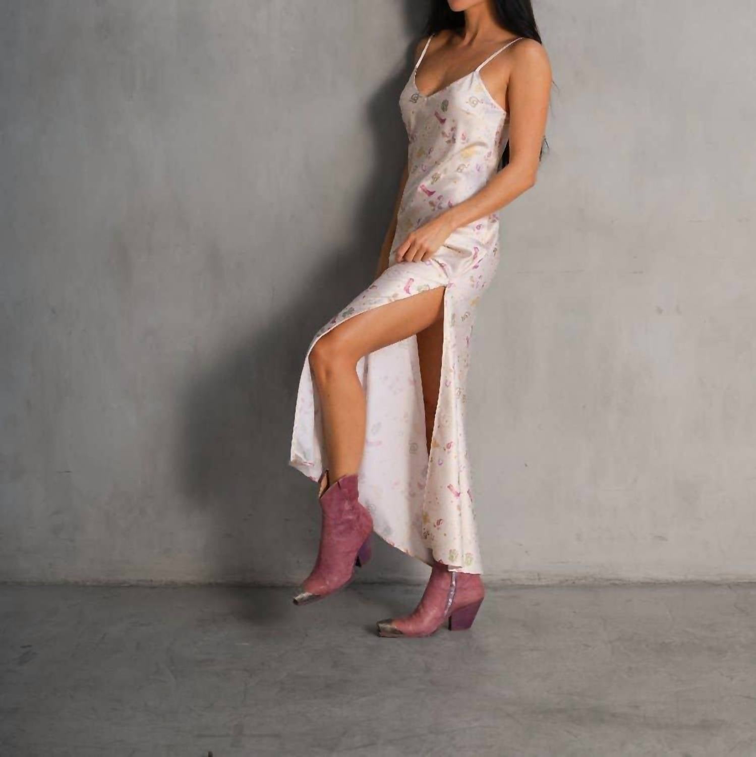 The perfect length dress does exist. Discover effortless style with the Lennon Zipslip™️ Dress by Care Tucker, a chic piece in ivory designed for modern versatility. Featuring spaghetti straps and crafted from high-quality polyester, this midi dress showcases a sophisticated Y2K-inspired graphic pattern. The thoughtful design includes a 65cm slit with a hidden zipper, allowing you to easily adjust your level of allure. Closure: Button closure. Care: Machine wash cold, lay flat to dry, do not iron. Model is wearing a size S (5'7", 35/C bust, 25" waist).