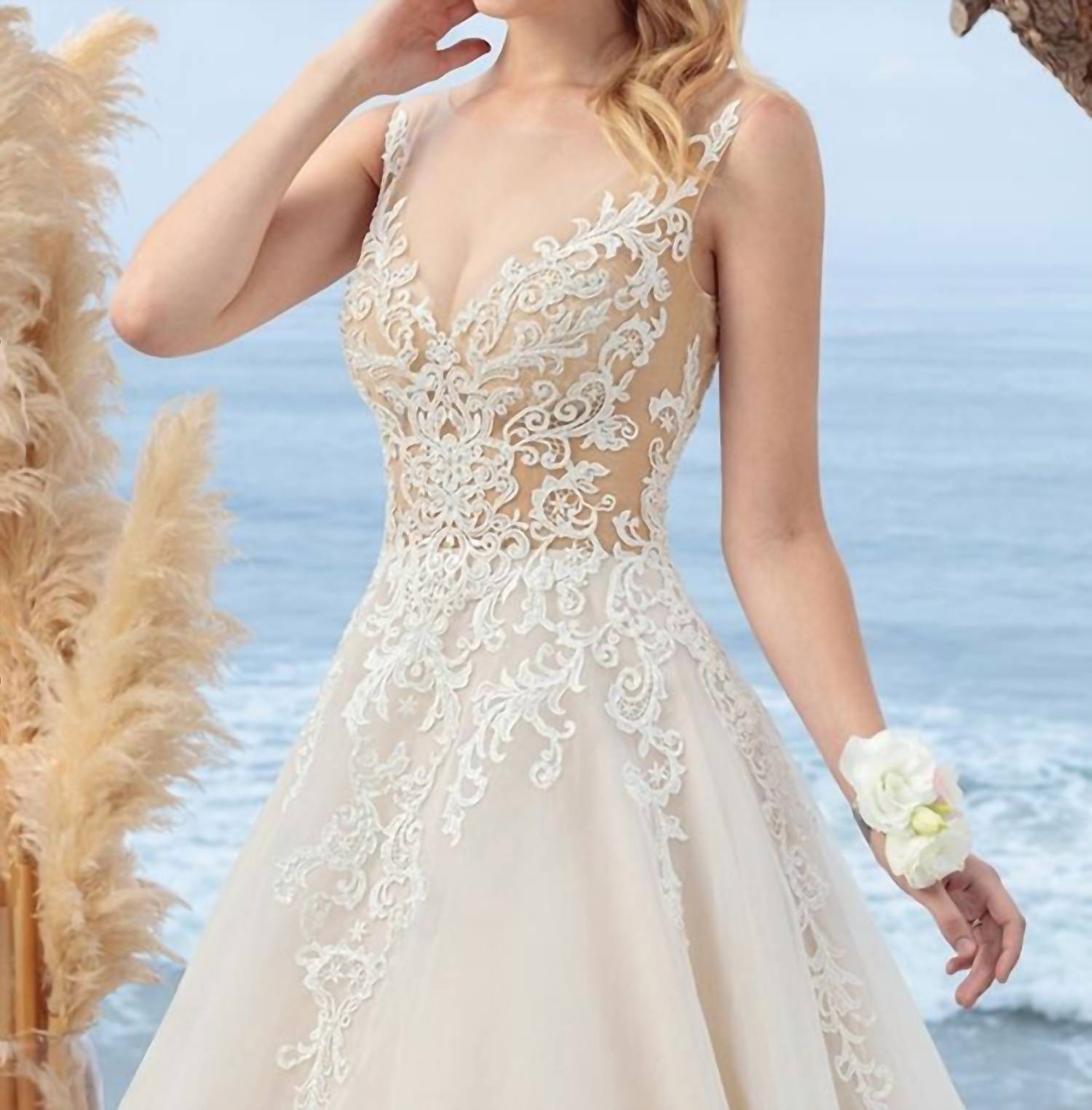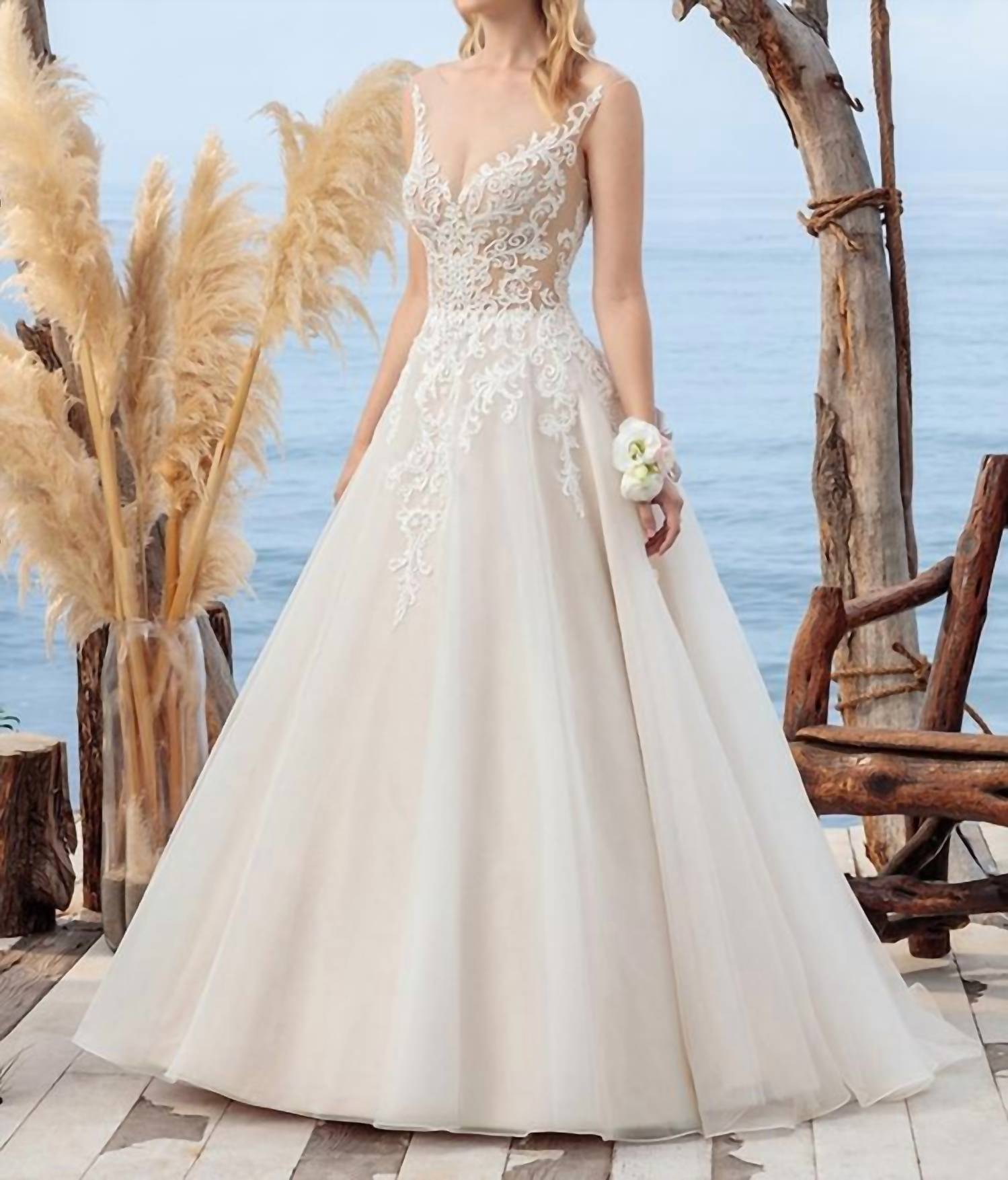 Say 'I do' in style and let your personality shine through in this elegant and timeless dress. With its classic silhouette, this is the perfect wedding dress for the stylish bride to be. Introducing the Coral Gown by Casablanca, a stunning choice for your wedding occasion in a captivating light nude and ivory palette. This sleeveless gown showcases a V-neckline and an A-line silhouette, with intricate lace appliques adorning the bodice for an ethereal look. Made for minimalists, the gown features an illusion back with trailing appliques and a dreamy sheer organza skirt. Closure: Button closure. Care: Dry clean only.