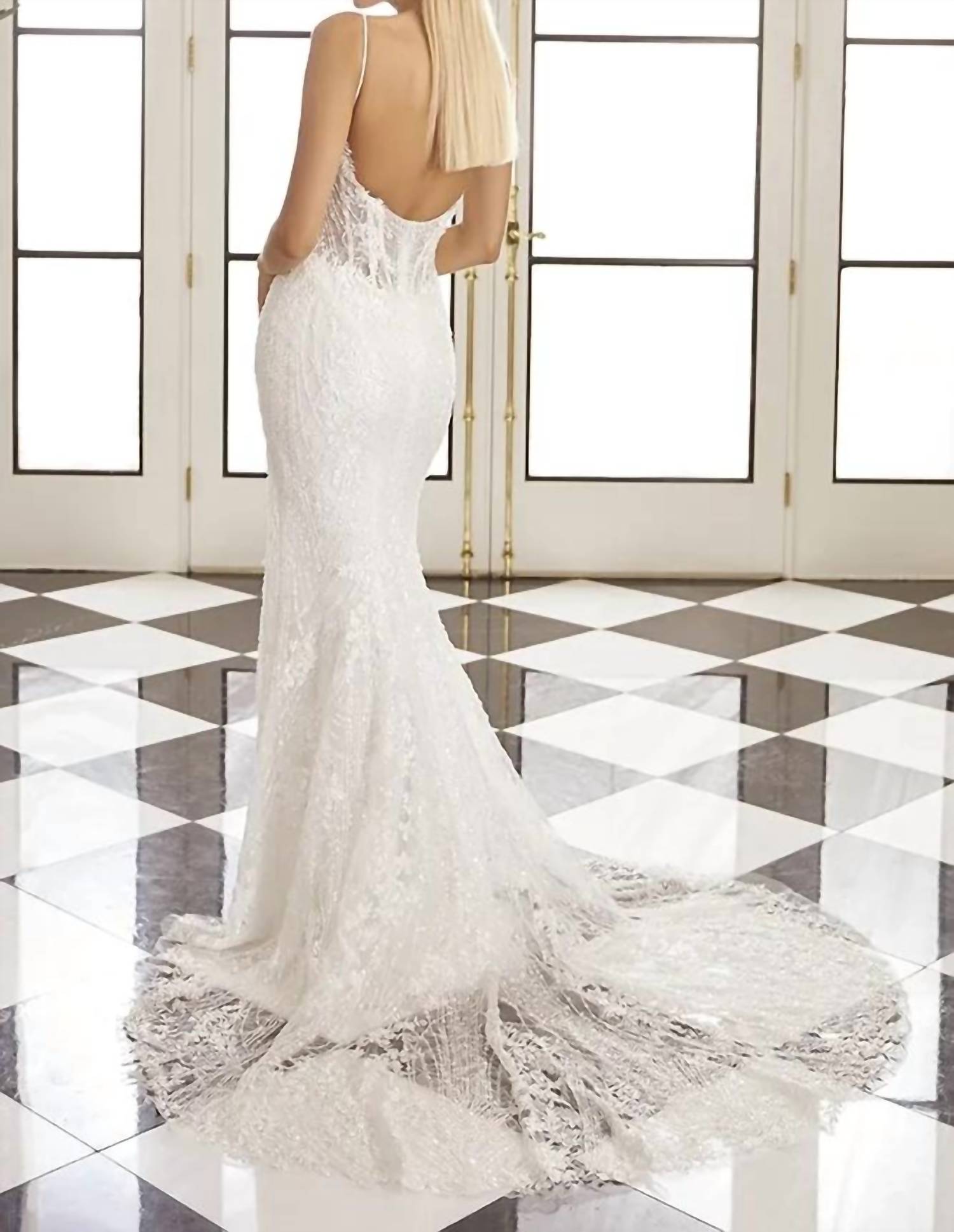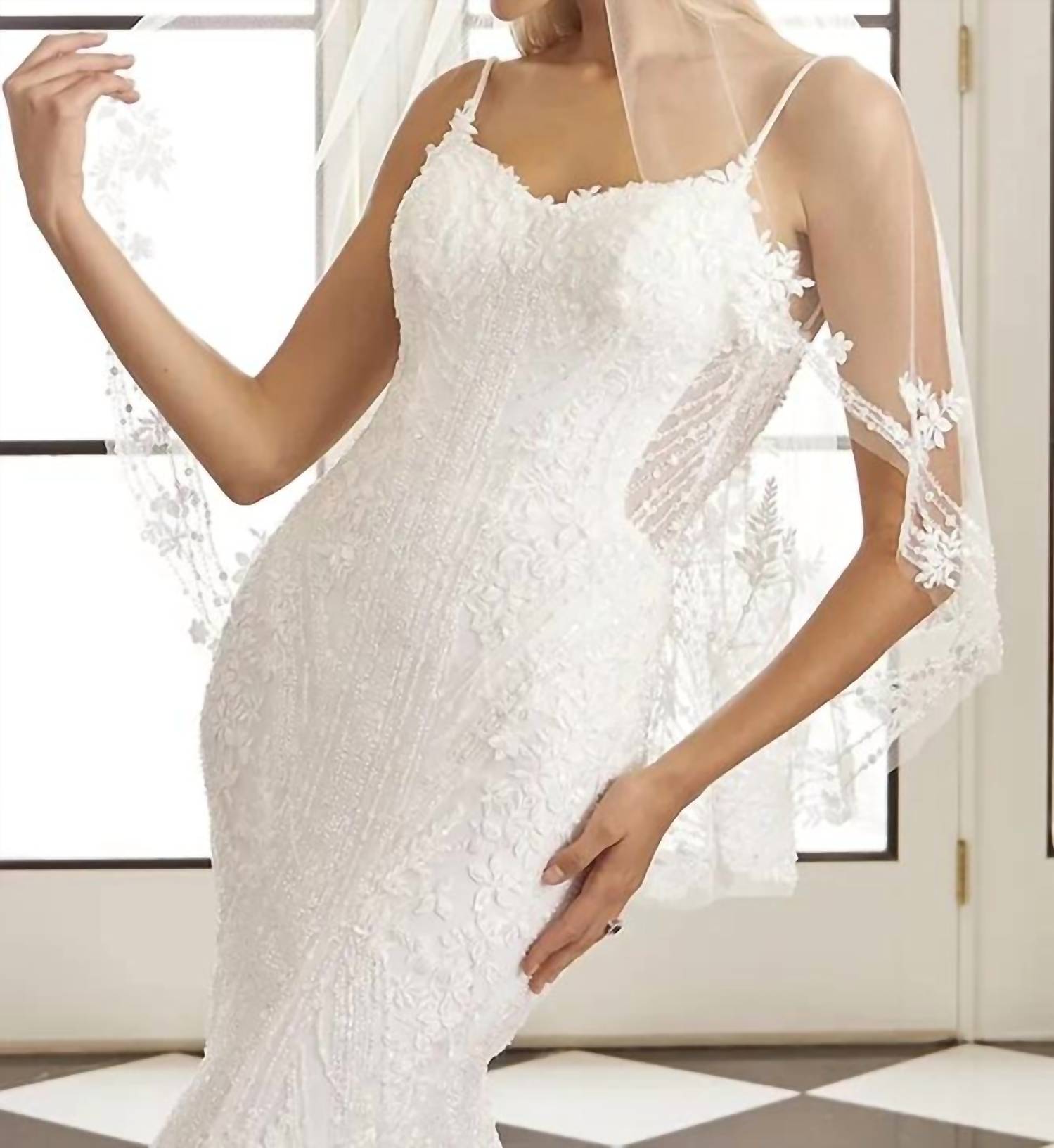 Designed for the bride who values understated elegance. Its classic design and perfect fit make it the ideal choice for your special day. Say yes to the dress! Meet the Virginia Wedding Dress by Casablanca, a stunning creation from their Fall '24 collection that embodies elegance and grace. This gown features delicate spaghetti straps and a flattering V-neckline, crafted from luxurious lace adorned with floral patterns, sequins, and beads. With a fit and flare silhouette, the 72-inch train adds a dramatic flourish to your bridal look. Closure: Zip closure. Embrace the allure of Hollywood royalty on your special day.