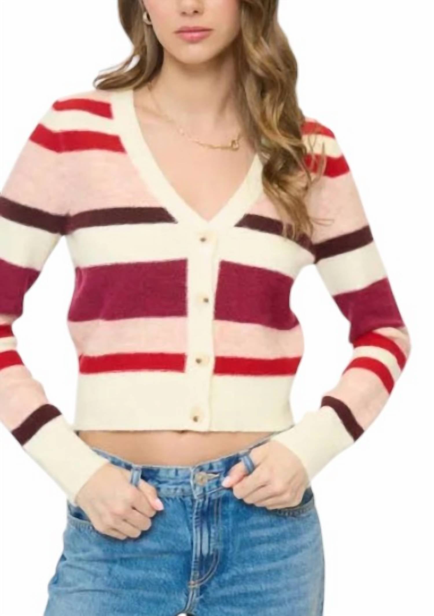Wear this v-neck sweater with your favorite denim for the perfect fall look. Introducing the Parker Striped Sweater by Central Park West, a stylish addition in Pink Multi to elevate your winter wardrobe. This sweater features long sleeves and a classic V-neckline, crafted from super soft acrylic material for optimum comfort. Designed with a button front closure, it also includes ribbed cuffs and hem for a polished finish. Care for this sweater by machine washing and tumble drying to maintain its cozy charm.