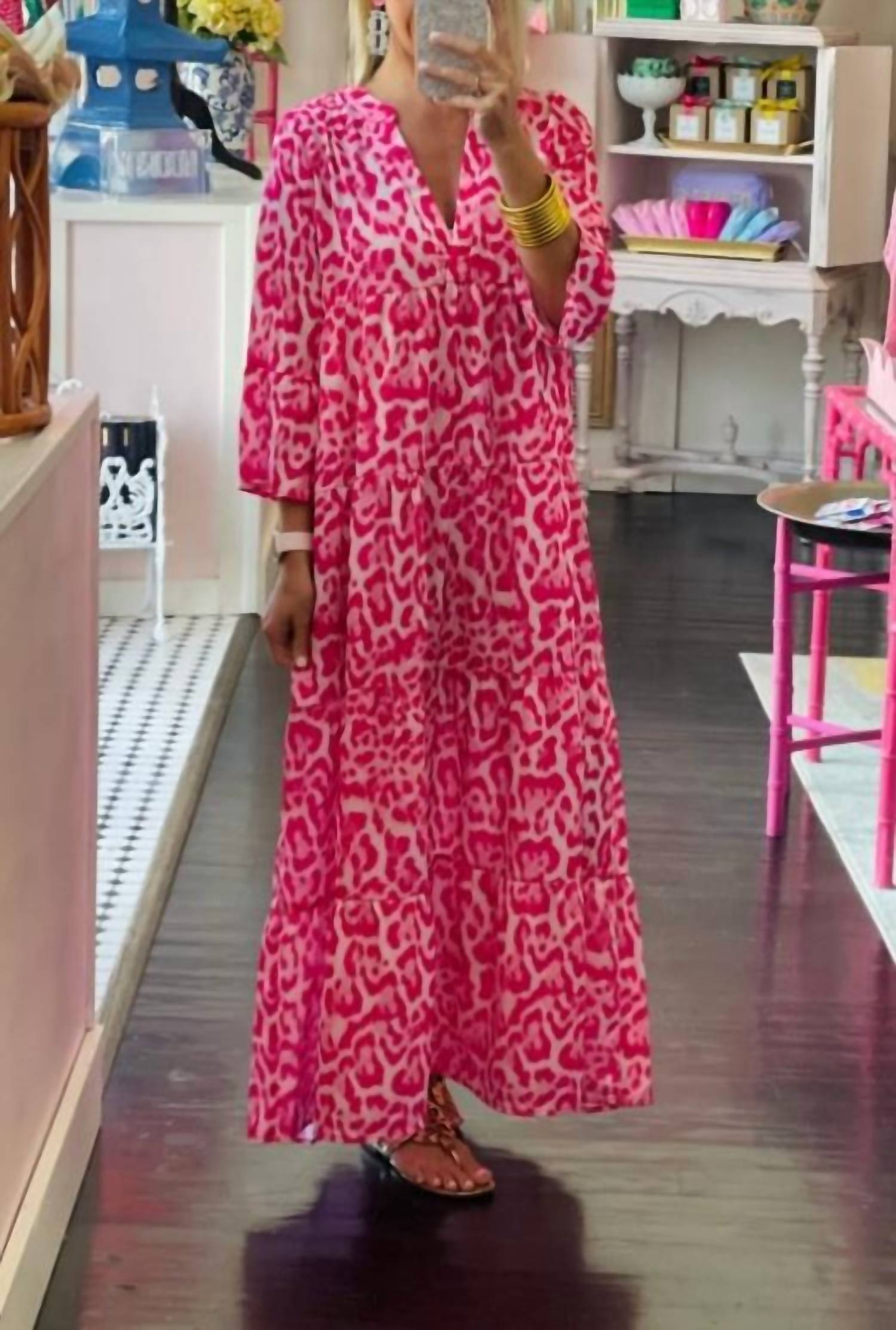 Who doesn't love a good maxi dress? This one you'll be reaching for season after season. Discover the Animal Print Maxi Dress by CEZELE, a striking piece that adds a hot pink twist to classic leopard print. Featuring three-quarter sleeves and a V-neck, this shift silhouette dress effortlessly combines style with comfort. Made for a maximalist vacation occasion, it comes in a convenient pull-on design. Care for this eye-catching piece with dry cleaning to maintain its vibrant allure.