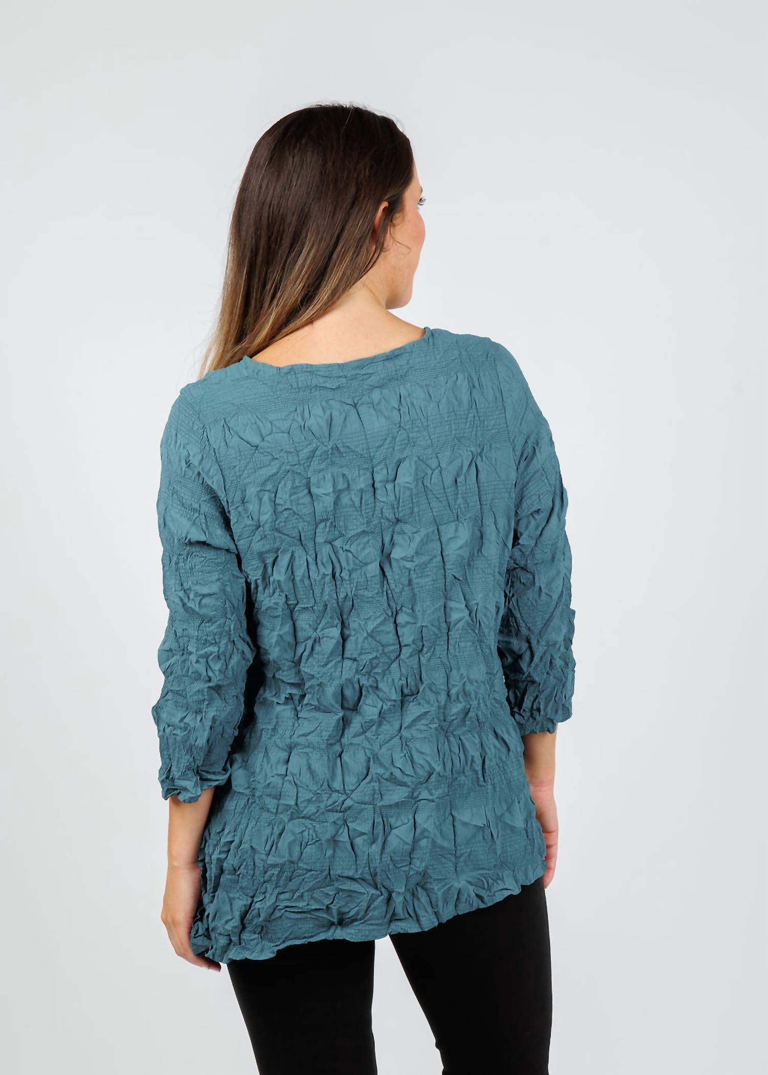Pair this with your favorite jeans and slides for your next girls night out. Introducing the Chalet et Ceci Ezra 3/4 Sleeve Top in a sophisticated Saxon hue, embodying the brand's signature crinkled texture and relaxed silhouette. This top features three-quarter sleeves, a round neckline, and an asymmetrical hemline, offering a touch of modern elegance and easy movement. Expertly crafted from 99% Polyester and 1% Spandex, it is travel-friendly and pull-on for effortless wear. Model is wearing a size XS and stands at 5'6" with a 34" bust, 28.5" waist, and 31" hip.