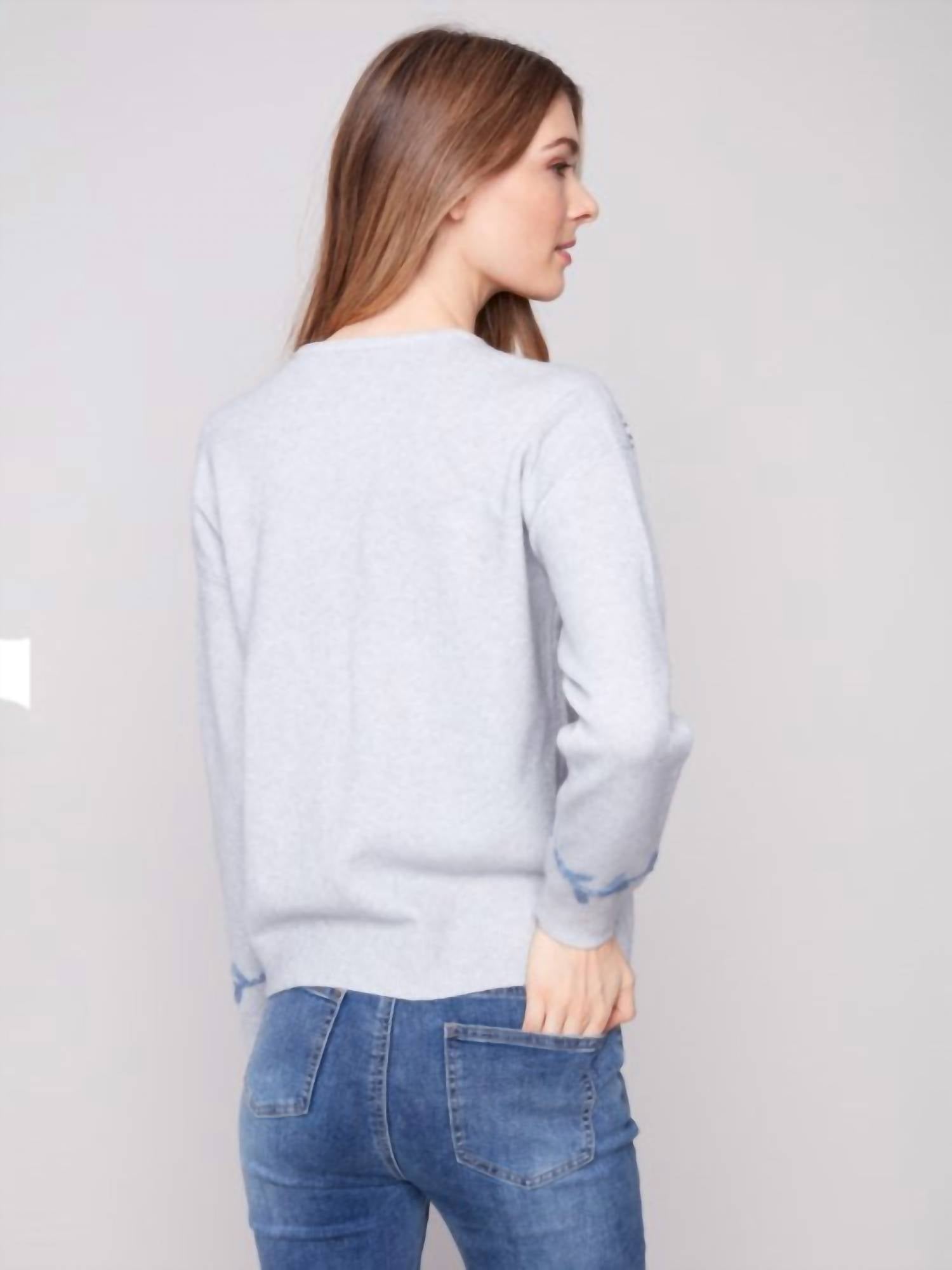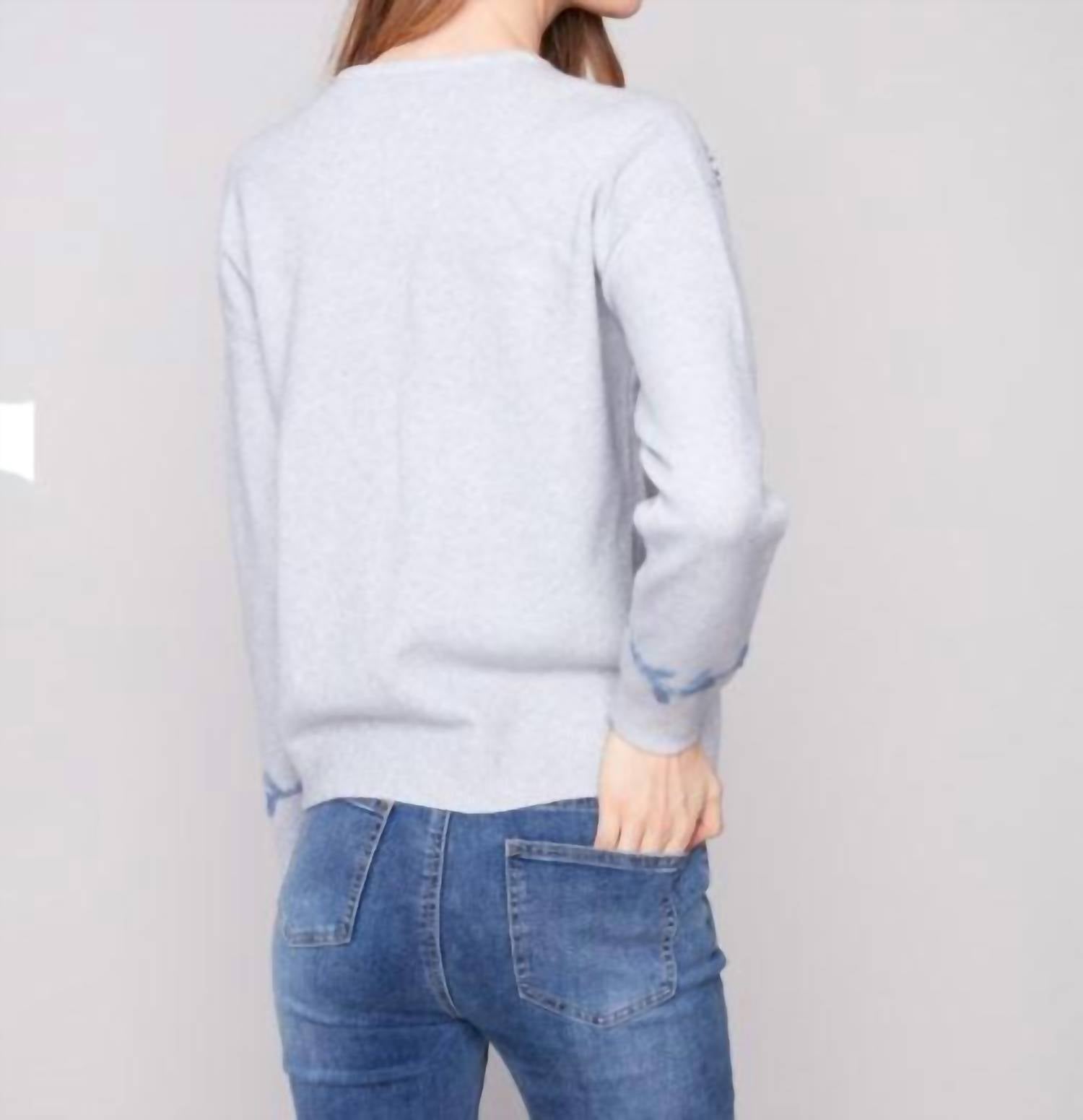 Experience the perfect blend of comfort and style with this trendy crew neck sweater, designed to effortlessly elevate your wardrobe. Pair it with your favorite denim and loafers for the perfect look. The Embroidered Crewneck Sweater by CHARLIE B is the perfect addition to your fall wardrobe. This long sleeve, pull-on sweater comes in a charming heather grey with delightful floral embroidery that instantly elevates your casual style. Designed for comfort and warmth, this piece is ideal for layering and pairs effortlessly with your favorite jeans. Embrace minimalist trends with this cozy companion on crisp autumn days.