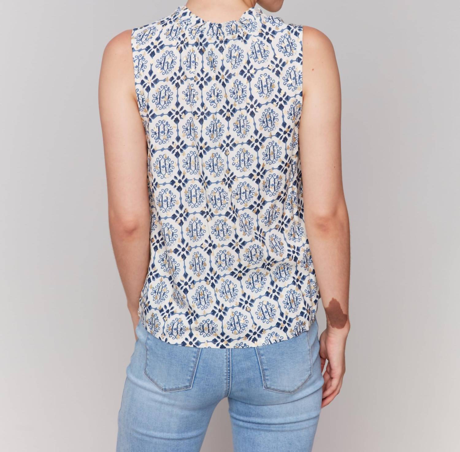 Pair this with your favorite jeans and slides for your next girls night out. Embrace the Boho Chic trend with the Printed Blouse with Ruffle Collar by CHARLIE B, a perfect addition to any vacation wardrobe. Crafted from soft Rayon, this sleeveless blouse features a stylish V-neck and a playful ruffle collar. The pull-on design ensures ease of wear, while the blue patterned fabric adds a touch of spring freshness. For care, simply hand wash and line dry to maintain its vibrant look.