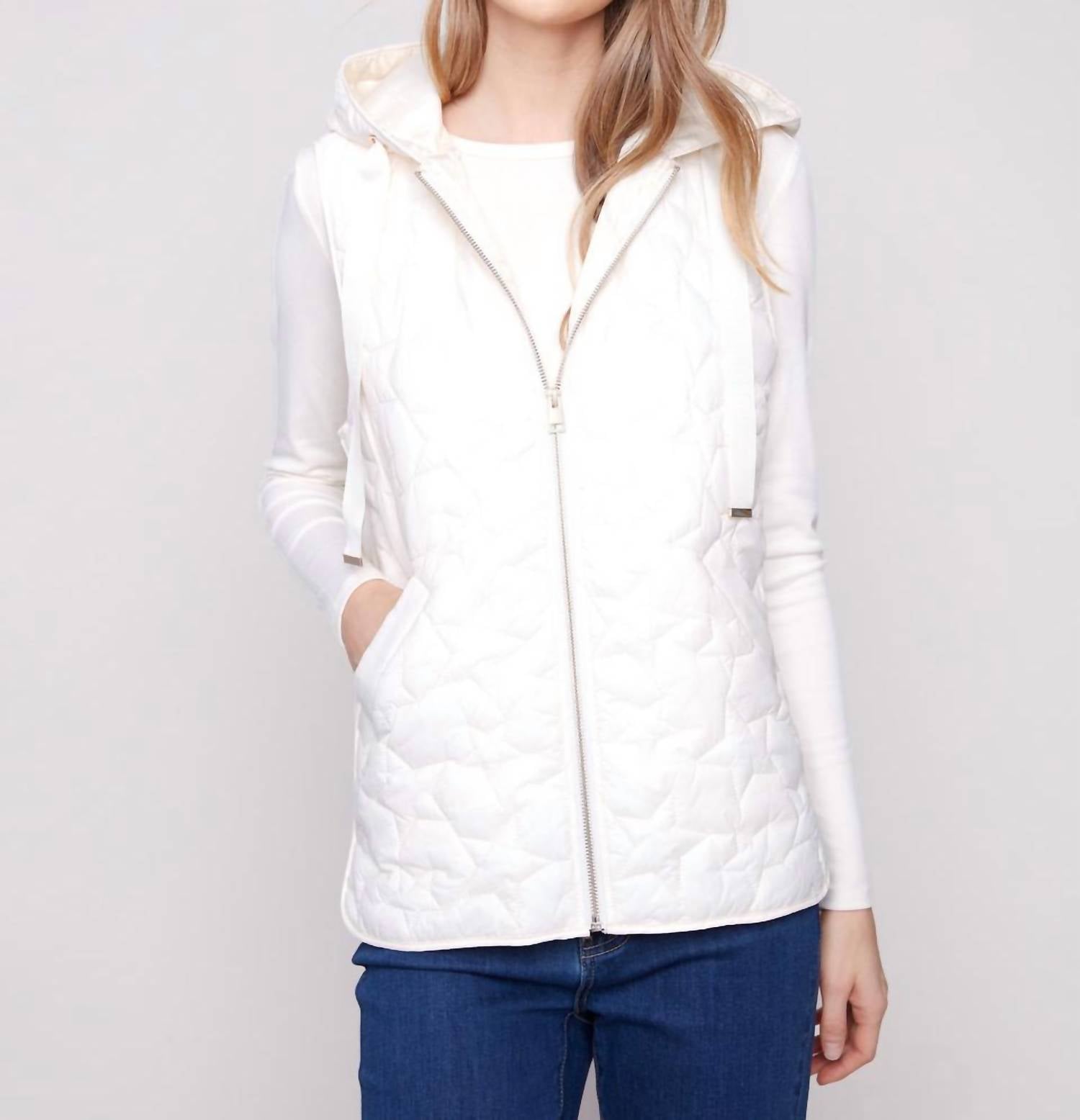 Throw this vest over an all black outfit for a perfectly polished look. Introducing the Charlie B Star Quilted Short Vest in Ecru, a perfect winter essential for women who value style and function. This sleeveless vest is crafted from durable 100% nylon with star quilting for both warmth and a trendy minimalist look. Featuring a hood with drawstrings and a zip closure, it offers practicality with welt pockets for storage. Easy to care for, simply machine wash on delicate in cold water and line dry for lasting wear.