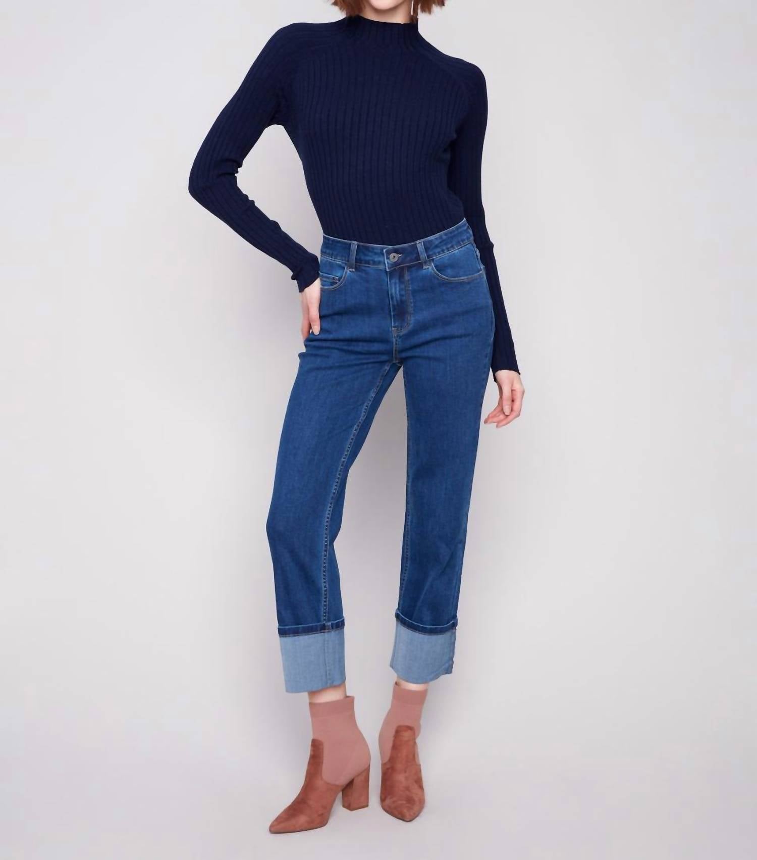This classic straight leg jean has a perfect fit and goes with just about everything. Discover the Wide Cuff Straight Leg Jeans by CHARLIE B, an essential for any wardrobe. Designed for women, these jeans are made from a comfortable cotton blend of 73% cotton, 23% polyester, 3% viscose, and 1% spandex, offering stretch for ease of movement. With a regular fit and high waist rise, the indigo medium wash jeans feature a button closure, five-pocket design, and a chic wide cuff at the hem. Perfect for travel and streetwear trends, these jeans are machine washable and should be line dried.