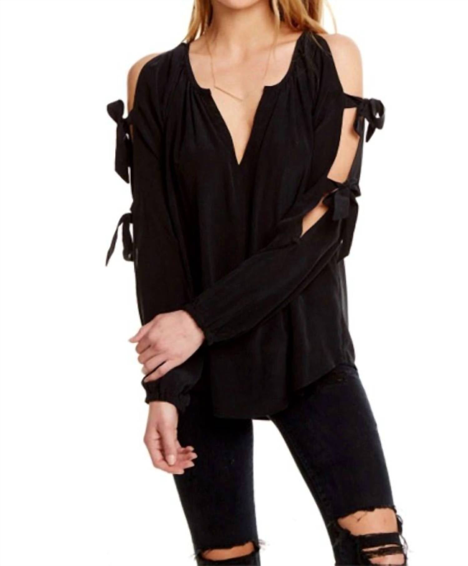 A long sleeve top you can wear with denim, skirts, well... just about anything! Elevate your wardrobe with the Silk Slit Blouson Sleeve Top by Chaser, a sophisticated piece designed for both day and night. This long sleeve top is crafted from 100% woven silk, offering a luxurious feel and stylish look in a sleek black monochrome. It features a feminine V-neckline, slit and tie blouson sleeves, and a convenient pull-on closure. An ideal choice for spring vacations, it is imported and recommended for hand wash care.