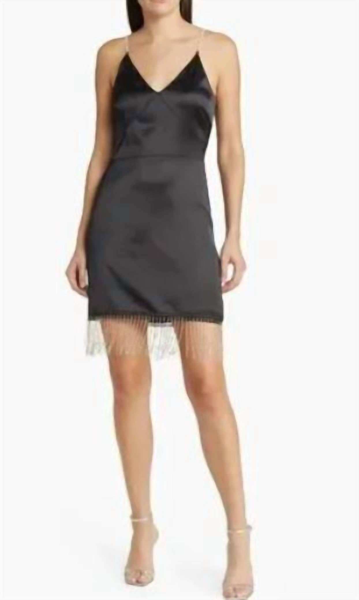 The kind of easy and flattering dress you'll be reaching for all season long. The perfect little black dress with a stone fringe embellished hemline, and straps. V neckline, back zipper closure, and adjustable straps.