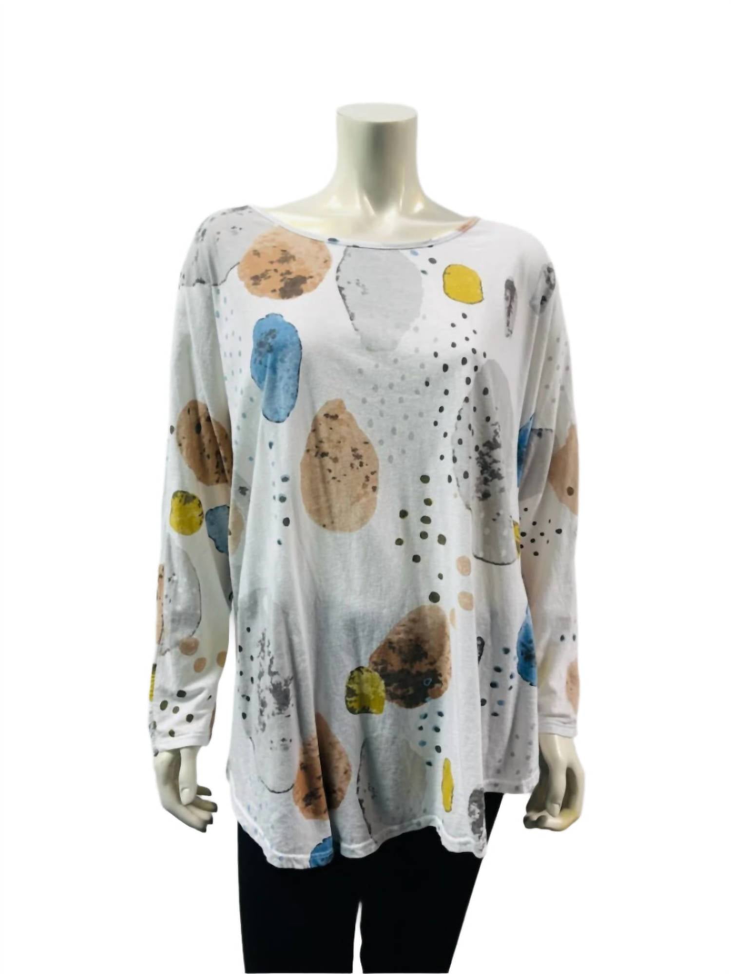 Discover the versatile charm of this tunic blouse, designed with both layering and standalone wear in mind. Its flattering silhouette and stylish details make it a closet essential. Introducing the Women's Tunic Top by Cherish, crafted for a stylish vacation look. This Italian-made tunic features long sleeves and a boatneck silhouette, highlighted by a vibrant watercolor print. Designed for a generous fit, it comes in a chic white multi-color with a playful polka dot pattern. Closure: Pull on. Ideal for summer, it's a nod to '90s fashion trends.