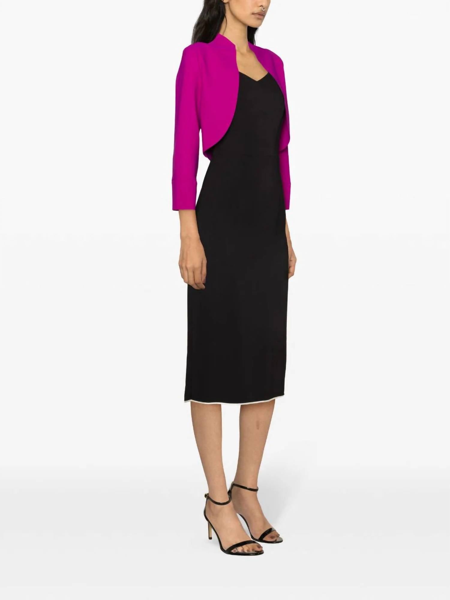 Tailored to perfection, this blazer will be your go-to jacket for years to come. Introducing the CHIARA BONI Mativel Bolero Jacket in vibrant fuchsia, the ideal selection for an elegant evening look or Valentine's Day event. This jacket offers long sleeves and a cropped length, crafted from a stretch design consisting of 72% Polyamide and 28% Elastane. Designed in a solid pattern, it features an open front without closure, making it versatile for layering over sleeveless attire. Care for this minimalist piece with machine wash instructions, while laying flat to dry.