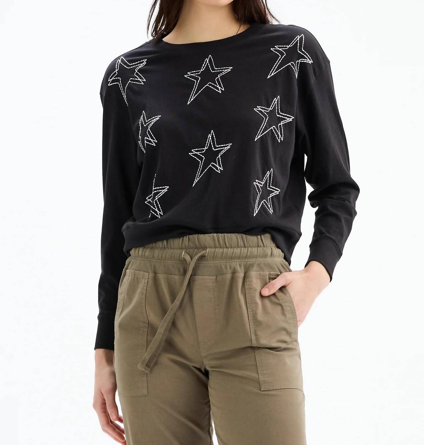 Great fit, cute design, soft fabric. You'll love everything about this long sleeve tee. Elevate your spring wardrobe with the Double Stars Long Sleeve Boatneck Top by CHRLDR, a perfect blend of minimalist style and comfort. Made from 100% Pima Cotton jersey, this pull-on top in classic black features an elegant boatneck and striking front embroidery detail. Originating from Peru, this graphic patterned piece is an ideal choice for a dinner party. Care instructions include machine wash and tumble dry for easy maintenance.