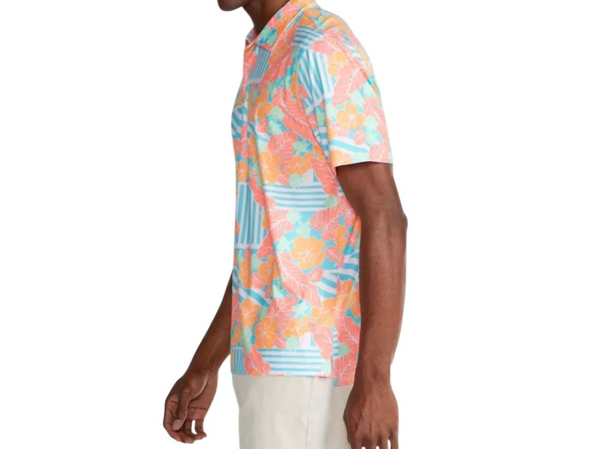 Introducing the Men's The Inspiration Performance Sleeve Golf Polo Shirt by Chubbies, a stylish and functional addition to any wardrobe. This short-sleeve polo is crafted from an 88% Polyester and 12% Spandex blend, offering unparalleled stretch and comfort. Designed with a collar and button closure, this multicolor floral piece is long enough to tuck in or leave out, perfect for a variety of occasions. Featuring moisture-wicking, anti-bacterial, anti-static properties and UPF 50+ protection, it ensures breathability and comfort on or off the course. Care is easy with machine wash instructions.