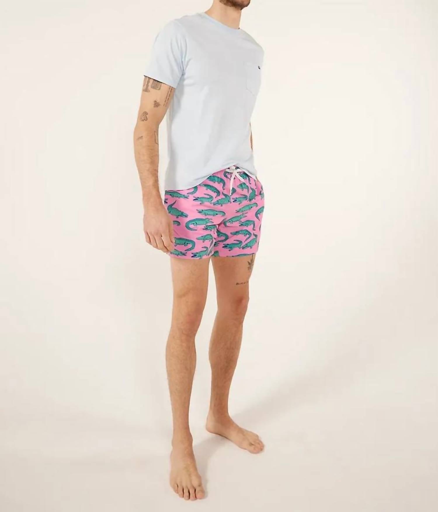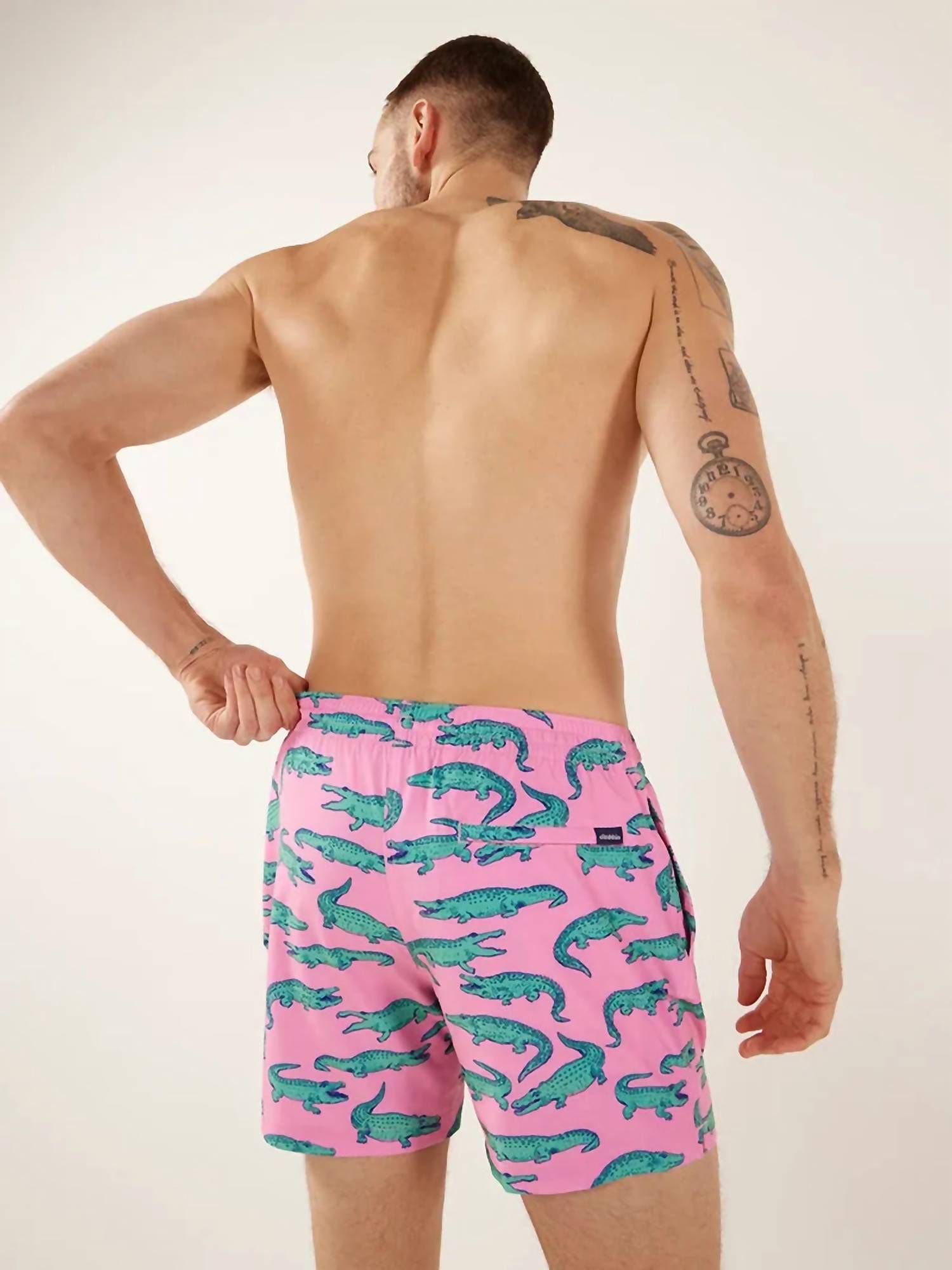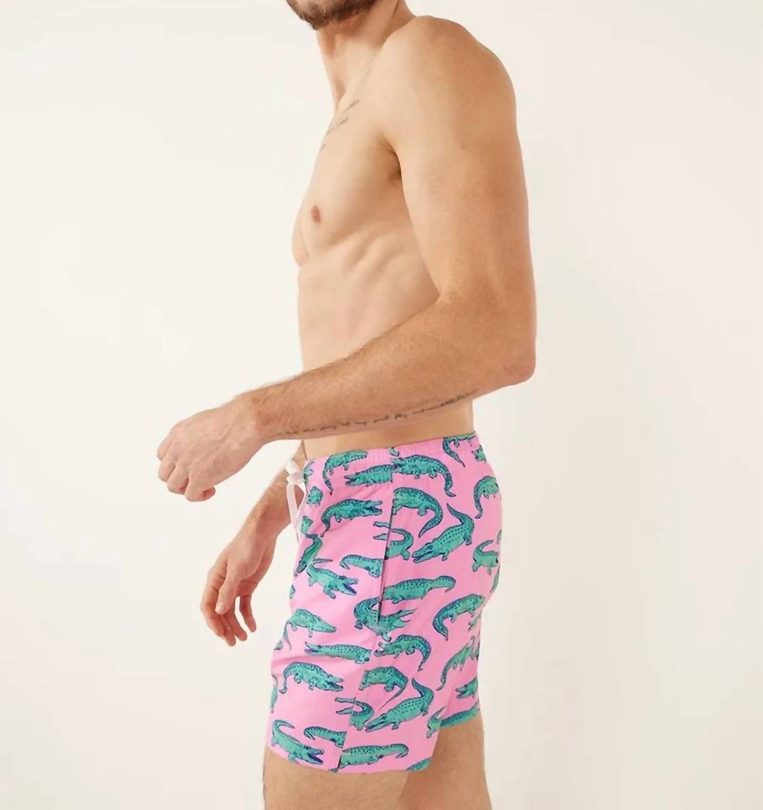 Dive into summer style with The Glades 5.5" Stretch Classic Swim Trunk by Chubbies, featuring a playful Pink Alligator print. These swim trunks are crafted from a flexible 92% polyester, 8% spandex blend, offering four-way stretch for enhanced movement and comfort. Tailored for ultimate summer versatility, they boast side mesh pockets for speedy water drainage and a secure zippered back pocket for your essentials. Care is a breeze with machine wash and tumble dry instructions.