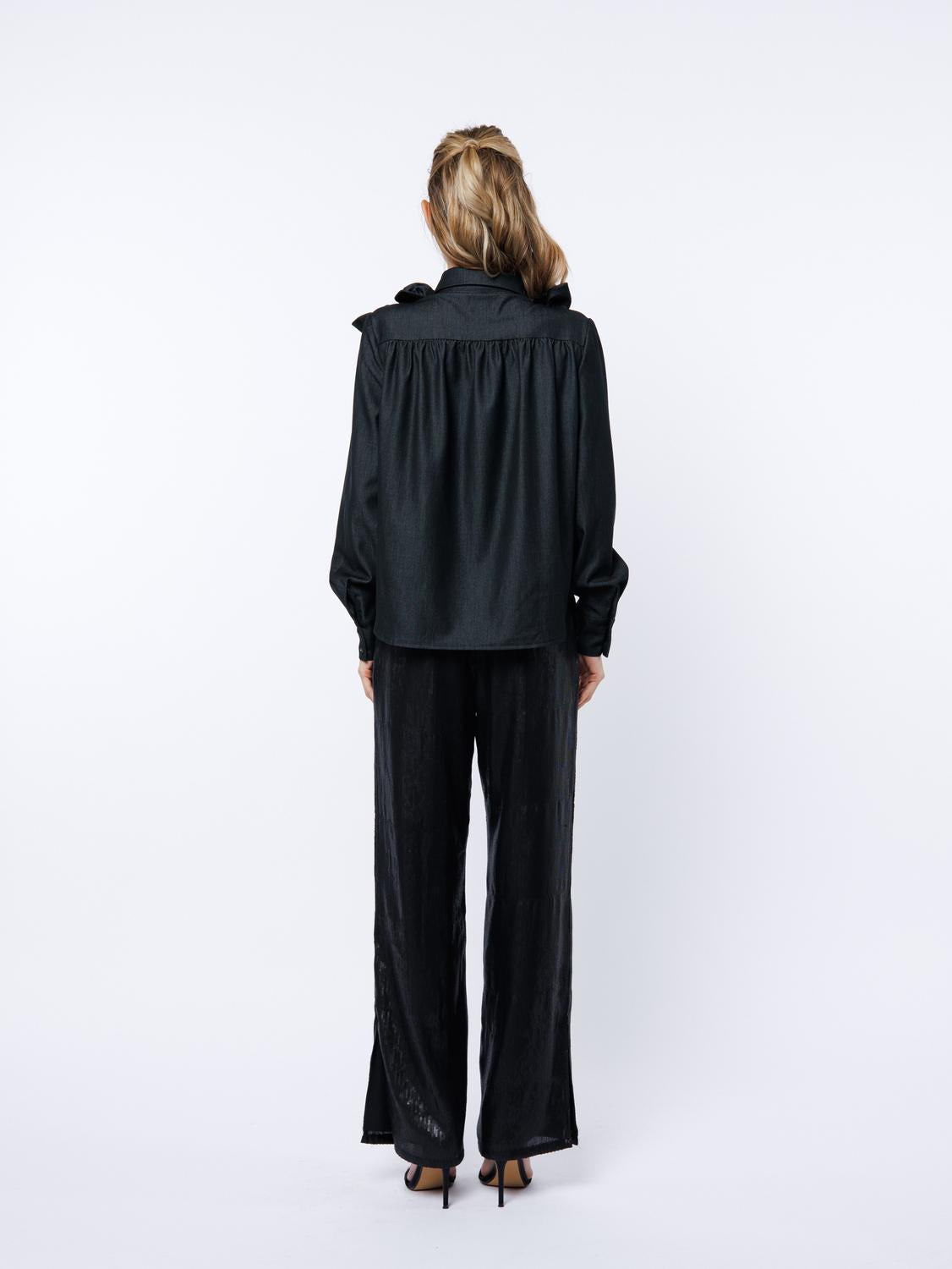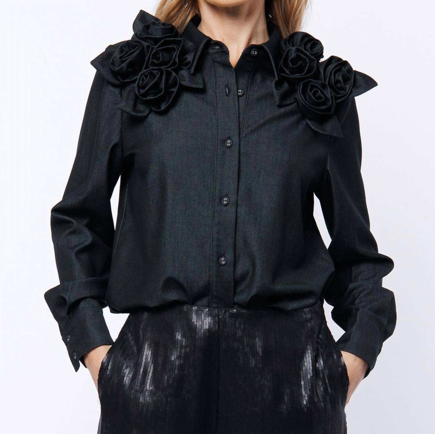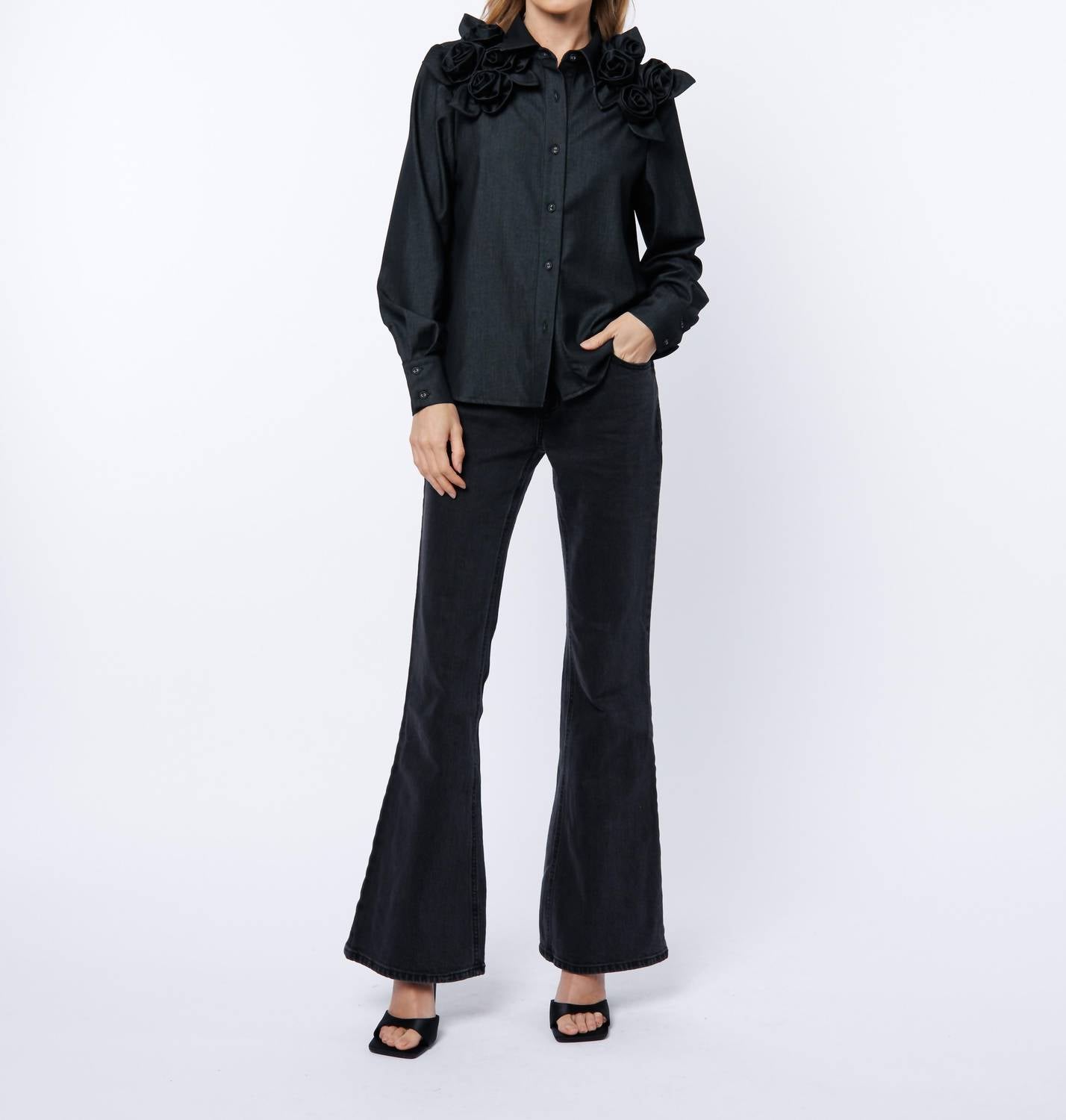The perfect long sleeve tee that goes with just about anything. Elevate your wardrobe with the Women's 3D Flowers Denim Shirt by CIEBON, a sophisticated take on the classic long-sleeve tee. This black shirt features intricate 3D floral embroidery and a graceful silhouette with long sleeves and two-button cuffs. Expertly crafted from 70% polyester, 25% rayon, and 5% spandex, it offers both style and comfort. Closure: Front button closure. Care: Hand wash and lay flat to dry. Imported.