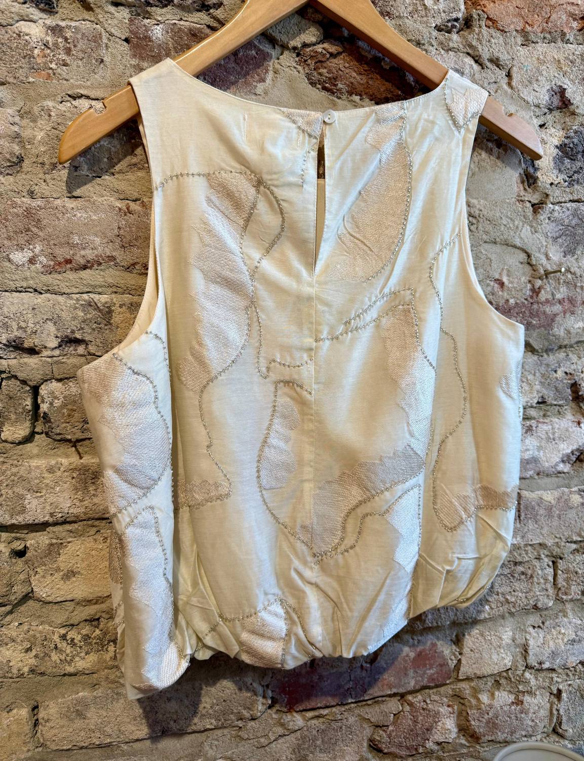 The perfect tank top for those warmer weather seasons. Discover the Beaded Bubble Tank Top by CIEBON, a chic minimalist piece perfect for cozy Thanksgiving celebrations or anniversary outings. This sleeveless tank, in a sophisticated beige with a solid pattern, features a flattering scoopneck and elegant bead detailing. Closure: Button closure. Care: Machine wash.