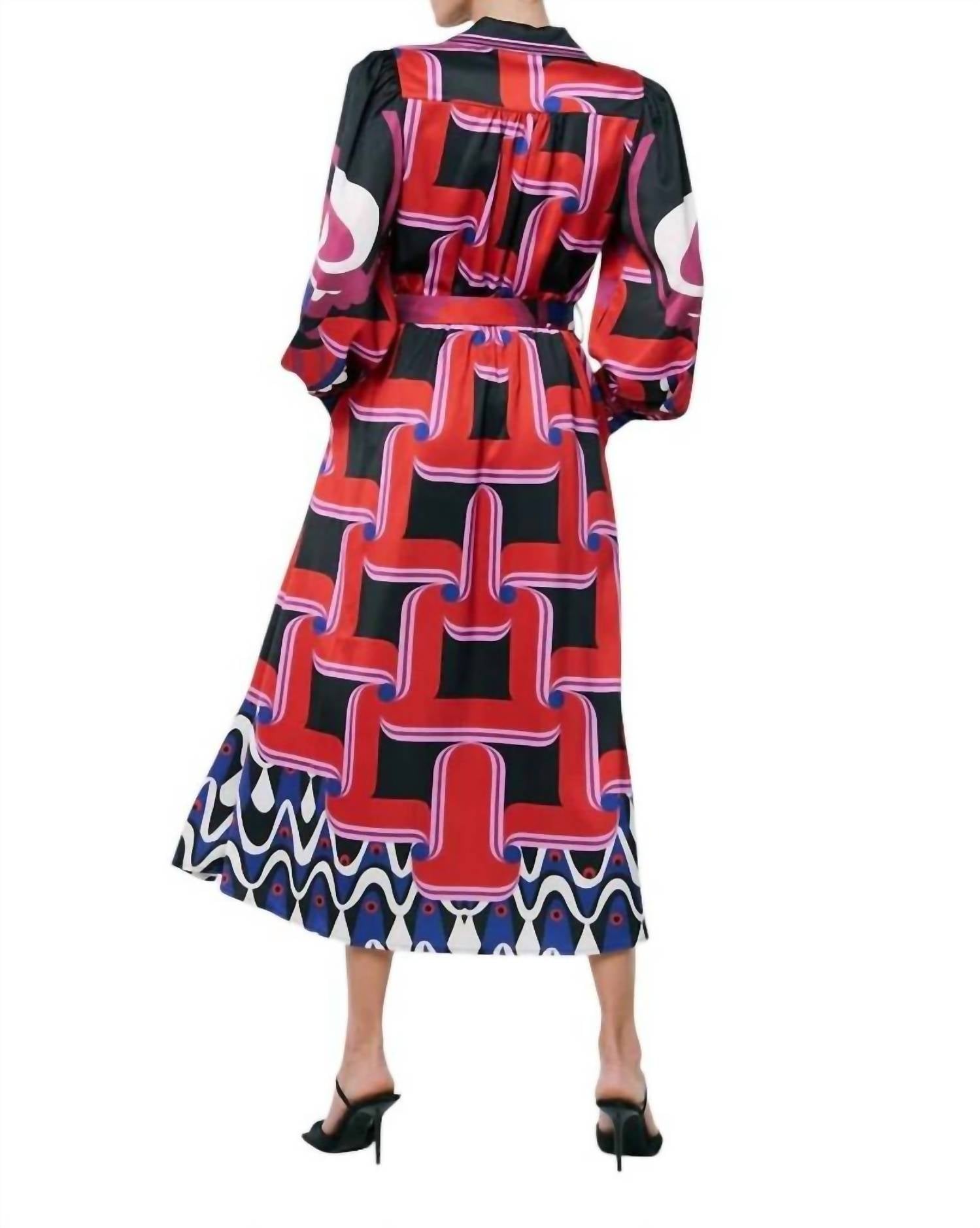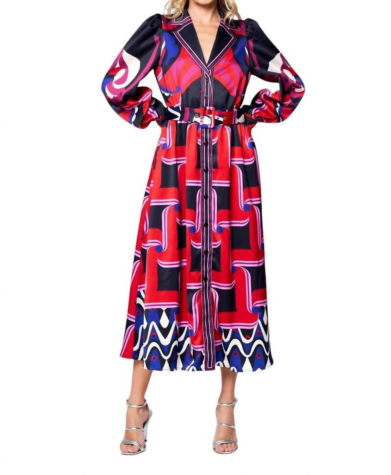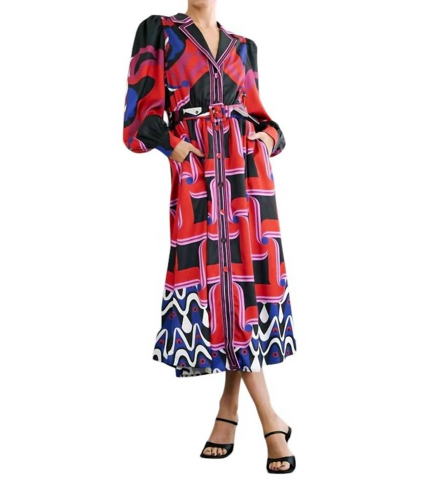 The pefect long sleeve dress for those cooler months. Introducing the Jessenia Engineered Swirl Shirt Dress by CIEBON, a stunning piece that redefines sophistication with a vivid geometric print. Featuring long sleeves with button cuffs, this dress is crafted from 100% polyester and measures 50" in length for a graceful A-line silhouette. With a front button closure and a removable wide belt, it offers both style and definition. Care for this elegant piece by hand washing and laying flat to dry, ensuring it remains a standout in your spring evening wardrobe.