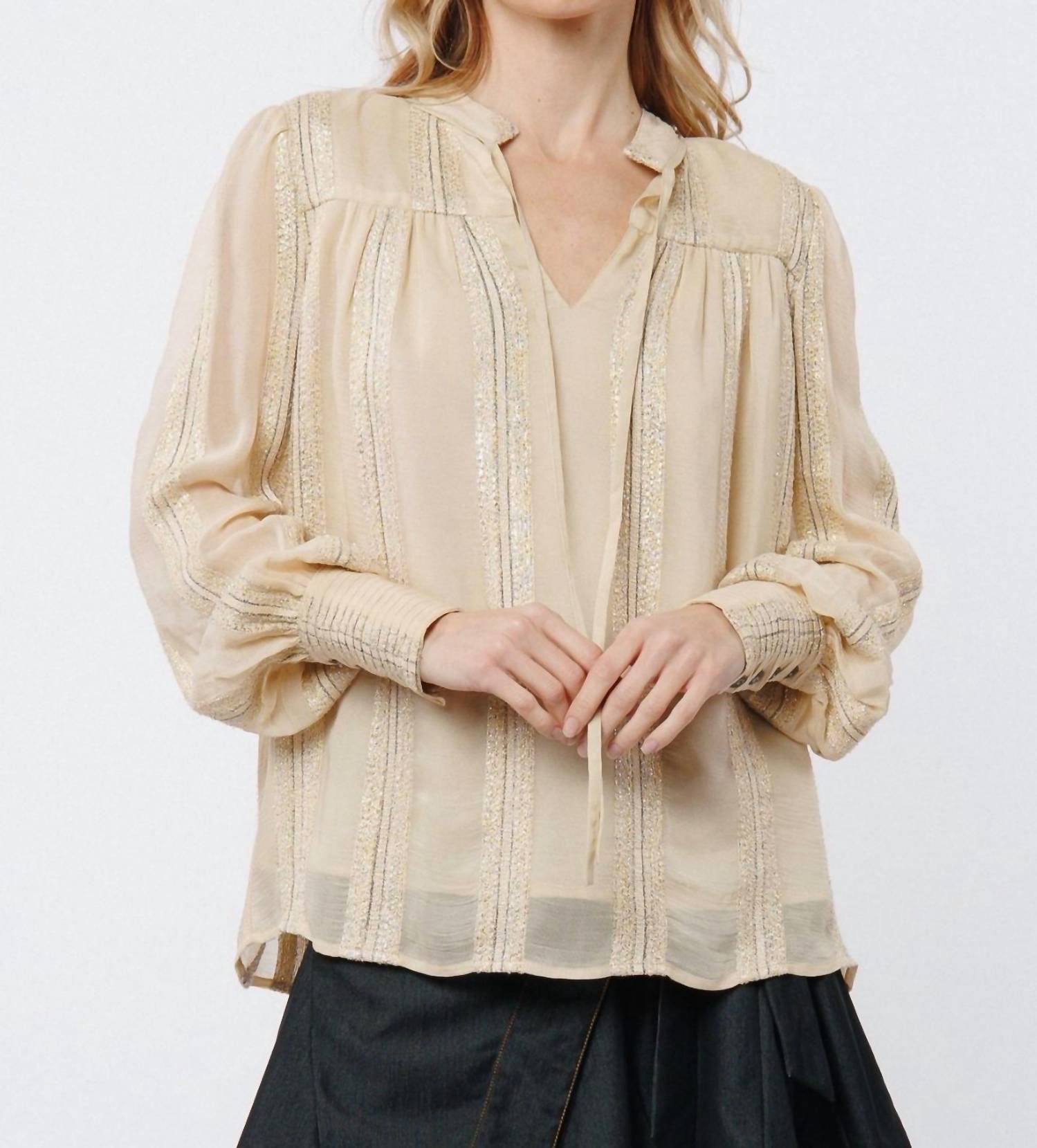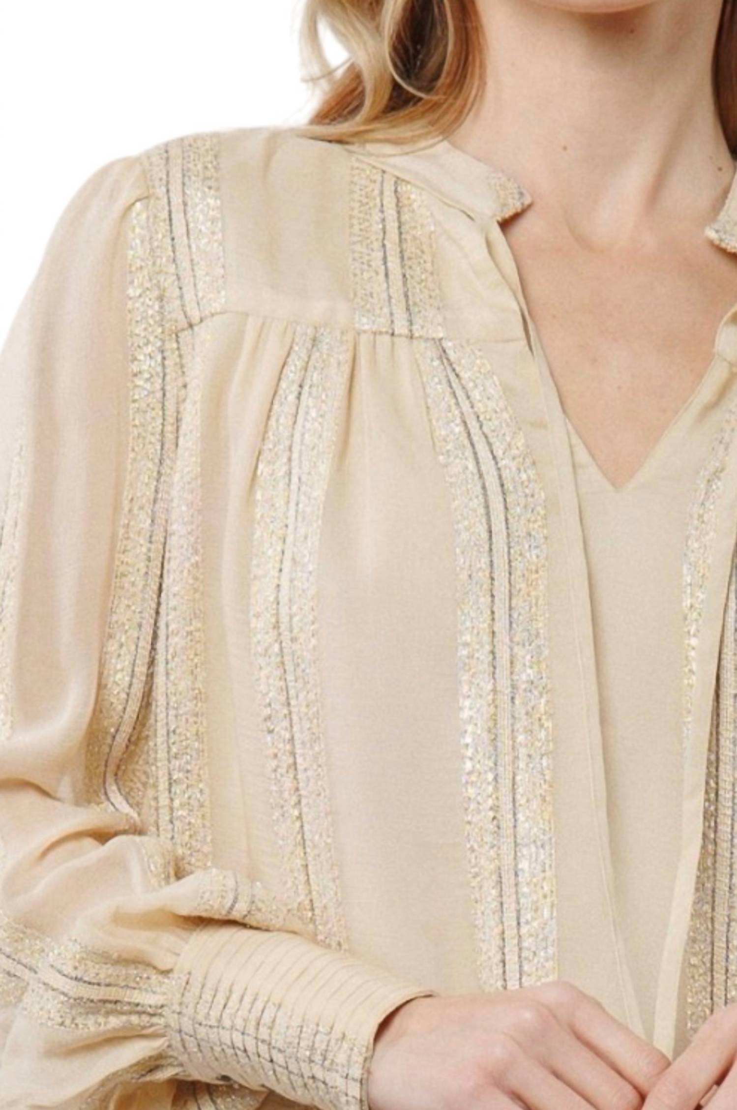 A timeless blouse that will never go out of style. Elevate your New Year's Eve look with the Metallic V Neck Blouse by CIEBON. Designed with elegant long sleeves, this cream patterned blouse embodies the trend of quiet luxury, perfect for a spring dinner party. It features a stylish V-neckline and a convenient tie closure, offering a chic yet simple way to complete your ensemble.