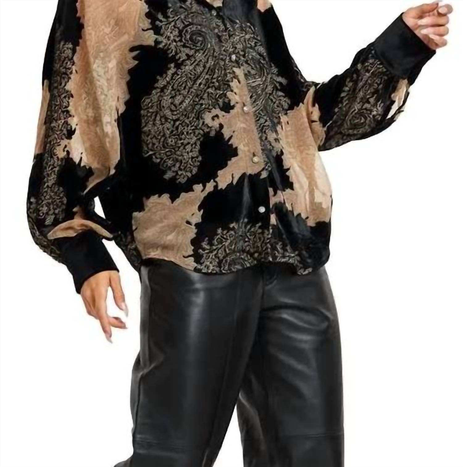 A timeless blouse that will never go out of style. Introducing the CIEBON Printed Velvet Burnout Batwing Button Down Top in a chic tan and black pattern. This women's blouse features long batwing sleeves and is crafted from a stylish viscose blend, perfect for a boho chic vibe. Closure is handled with a button closure, making it ideal for a sophisticated yet comfortable fit. Care is simple: hand wash and lay flat to dry, ensuring longevity and maintaining its elegant texture.