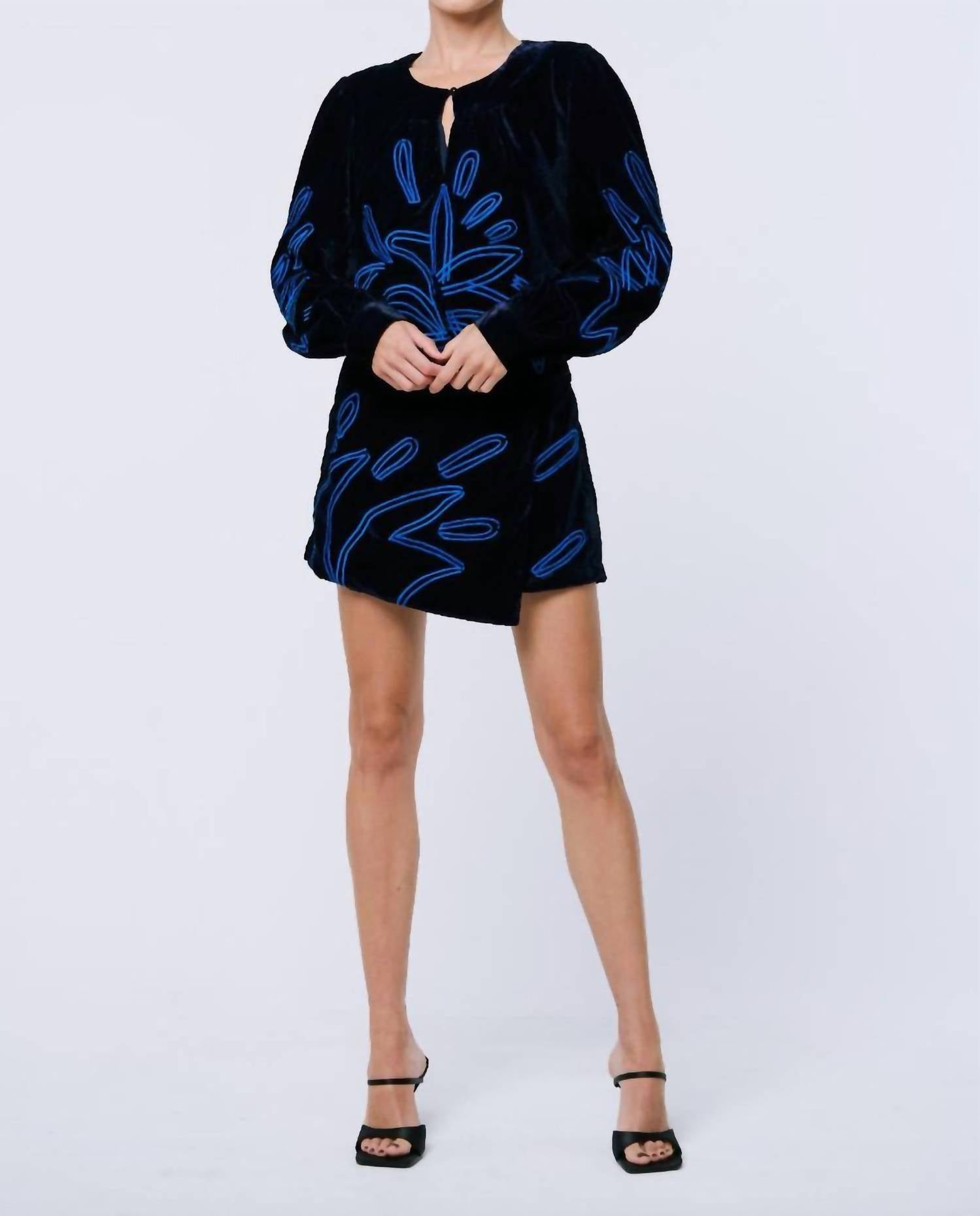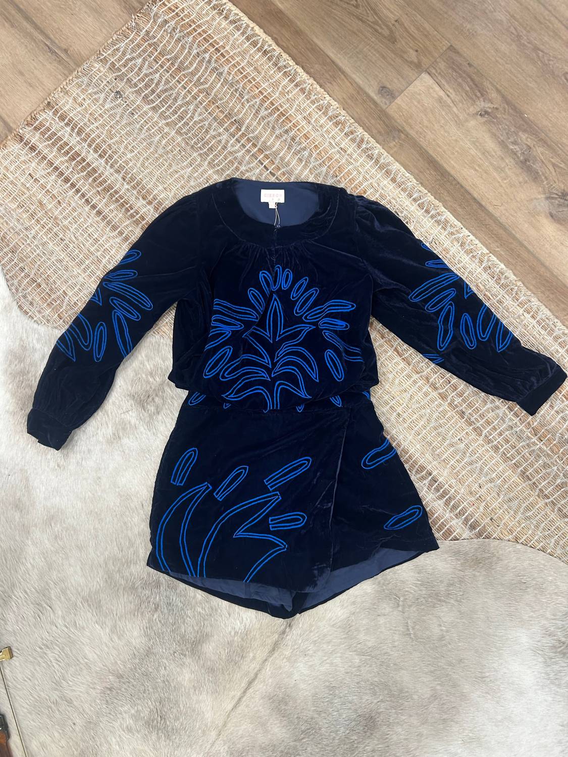 The cutest skort that combines style and functionality. Discover the Rena Velvet Skort by CIEBON, an ideal choice for your spring vacation wardrobe. This minimalist skort in a striking blue hue features a chic patterned design without pockets for a sleek look. Enjoy the convenience of a zip closure for easy wear. For best care, dry clean only.