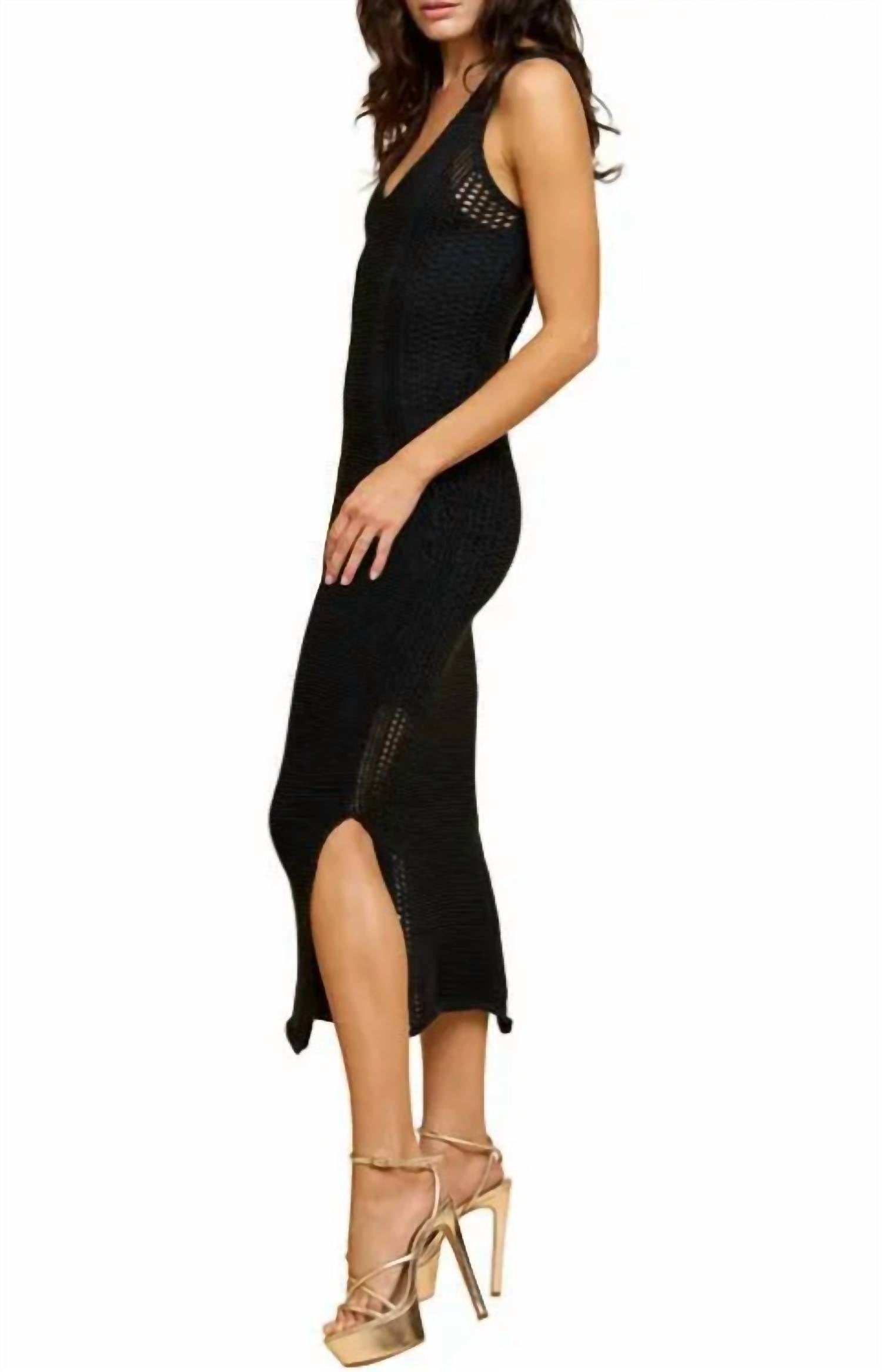 Just add slides or mules and you are good to go. The Sleeveless Knit Midi Dress by CIEBON brings a stylish edge to your wardrobe with its bodycon fit and V-neck design, crafted for evening events and spring occasions. This black, textured piece, made from 60% polyester and 40% cotton, features a 95% polyester, 5% spandex slip lining for added comfort. Built with a pullover style, this 46-inch long dress offers an airy side vent to enhance its silhouette. Care for this garment by hand washing and ensuring it is laid flat to dry.