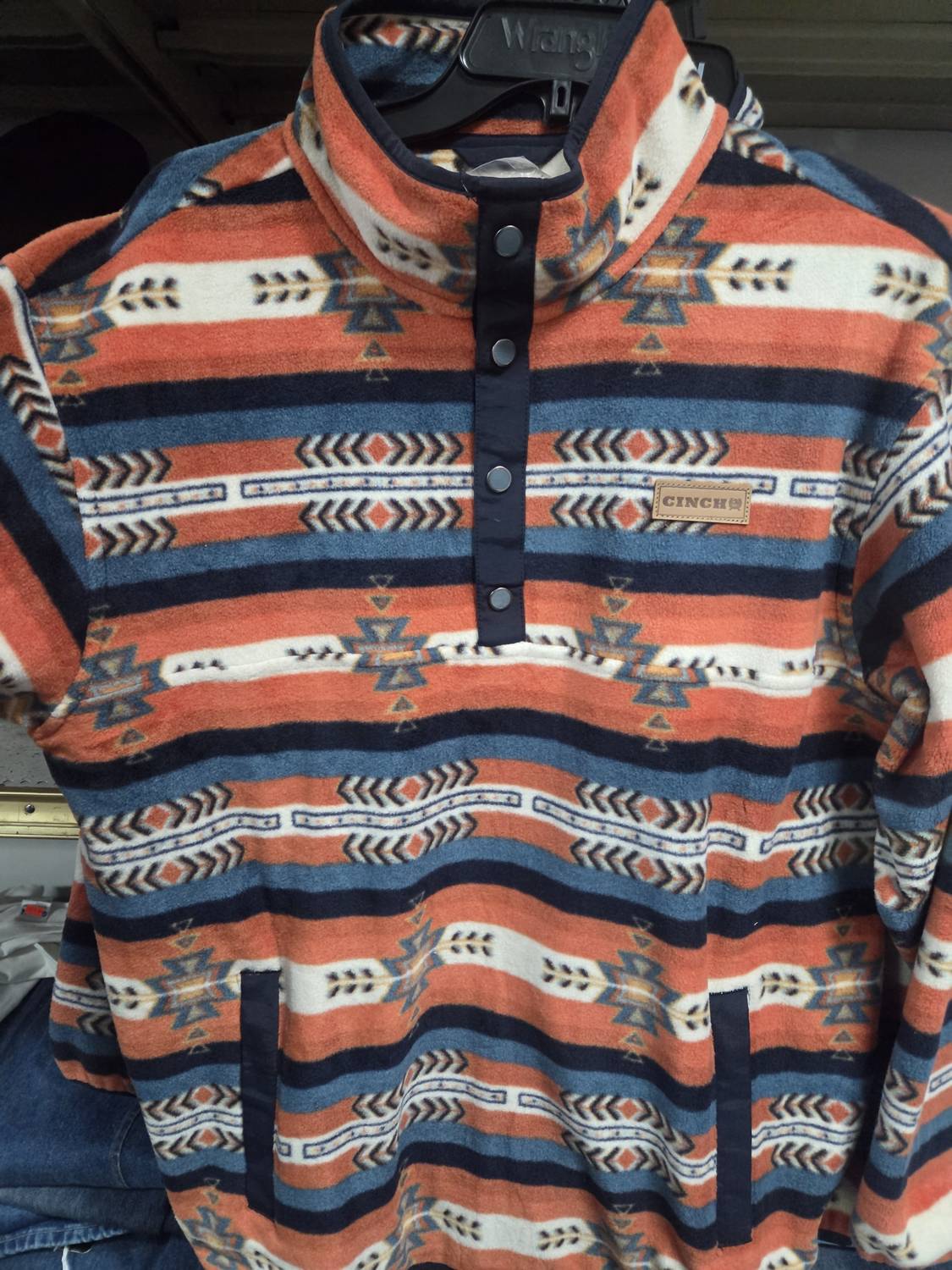 This red, orange, and blue Aztec print pullover from Cinch is made from a 95% polyester and 5% spandex blend, designed with a polar fleece fabrication for comfort and warmth. It features a stand-up collar, long sleeves, a snap placket, and both a front kangaroo pocket and convenient hand pockets. The garment also includes a faux leather Cinch logo patch and care instructions specify machine wash cold, gentle tumble dry low or line dry, with no ironing or dry cleaning recommended.