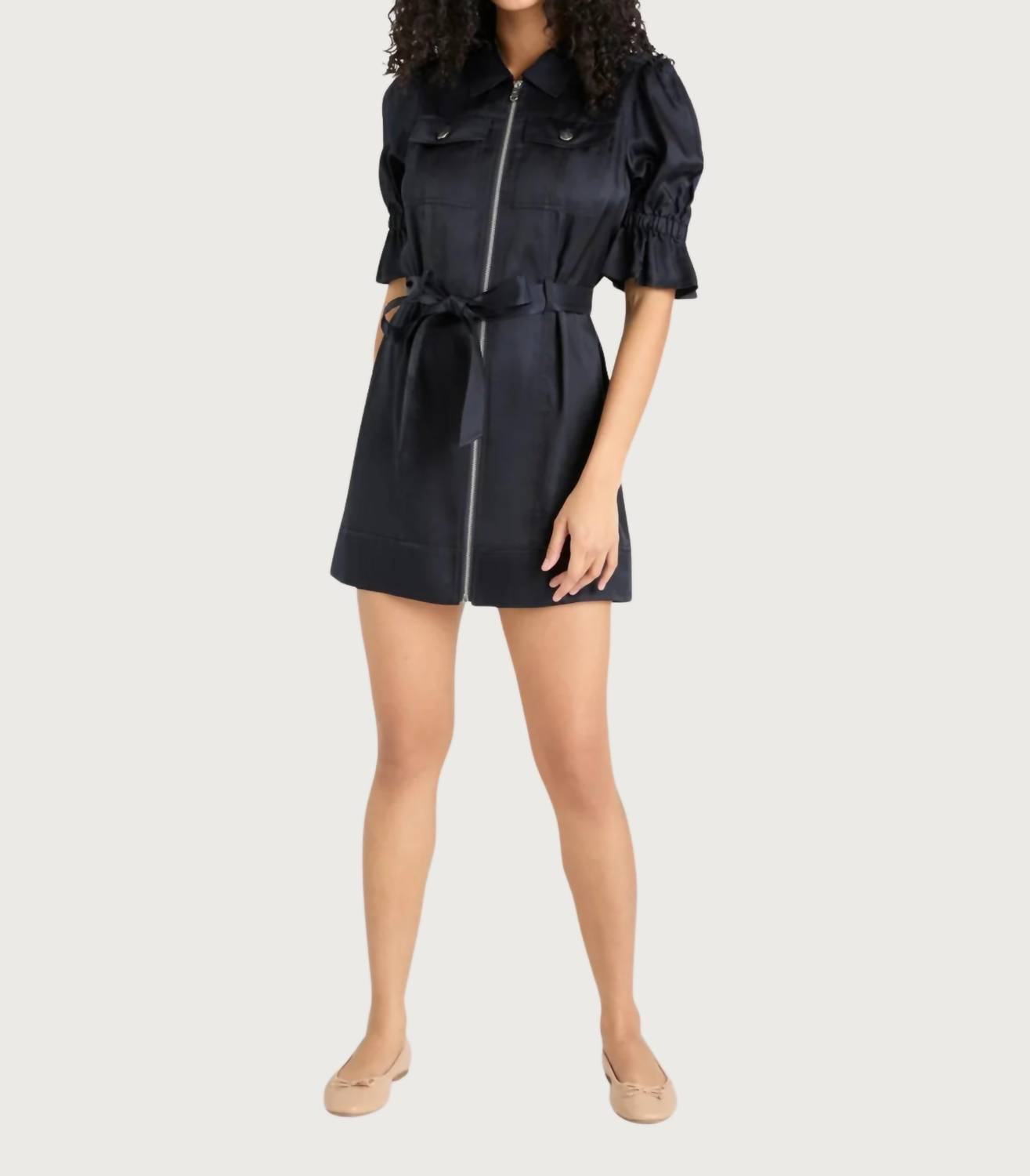 The perfect mini dress for those warmer months. The Holly Mini Dress by Cinq à Sept in black is a beautifully crafted piece from luxurious cupro fabric, ensuring a smooth and flowy texture. With its short sleeves, this shirt dress offers a flattering, feminine silhouette perfect for evening events or a boho chic vibe. Closure is provided by a zip, adding practicality to its elegant design. Its chic and sophisticated style is ideal for spring and special occasions like Valentine's Day.
