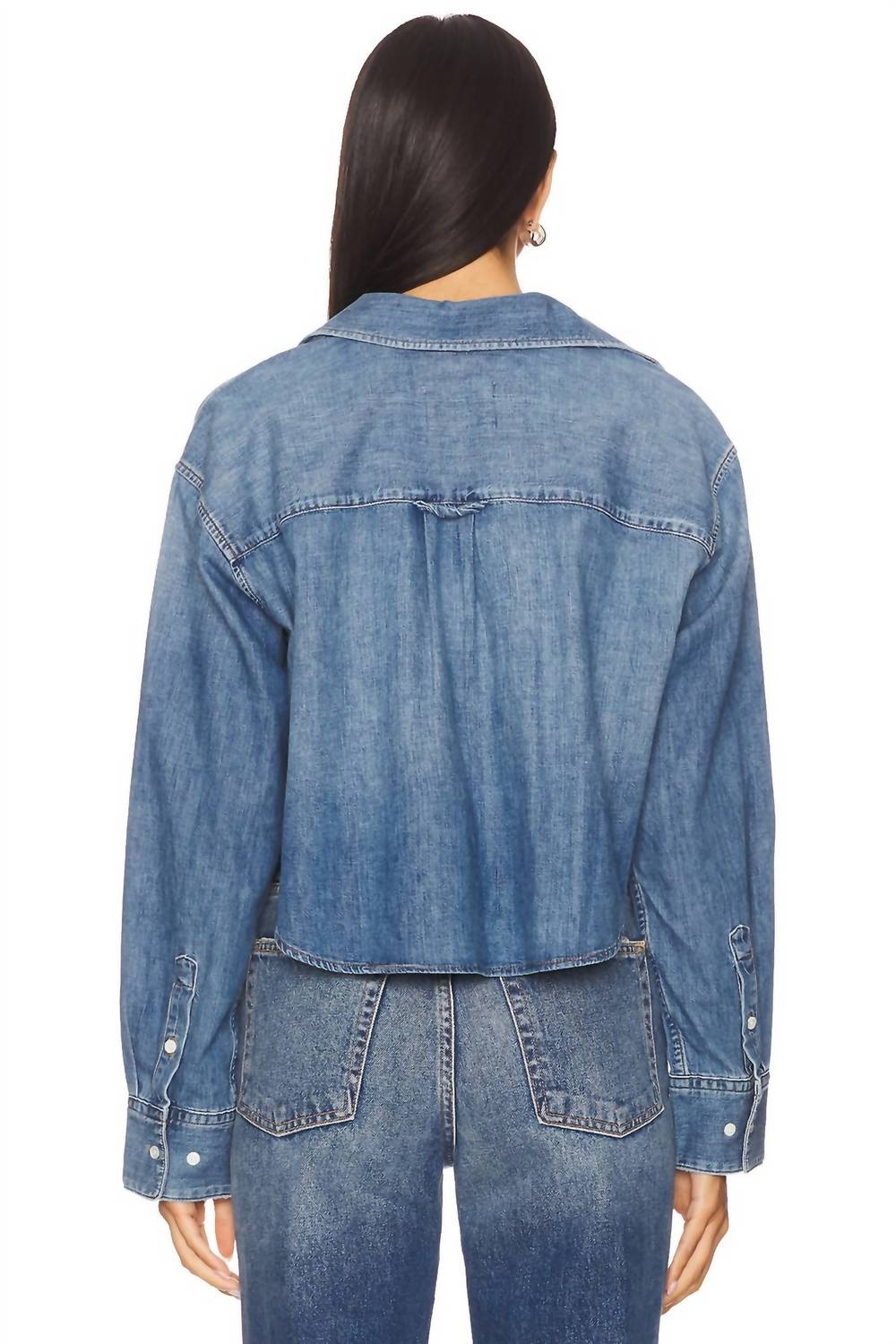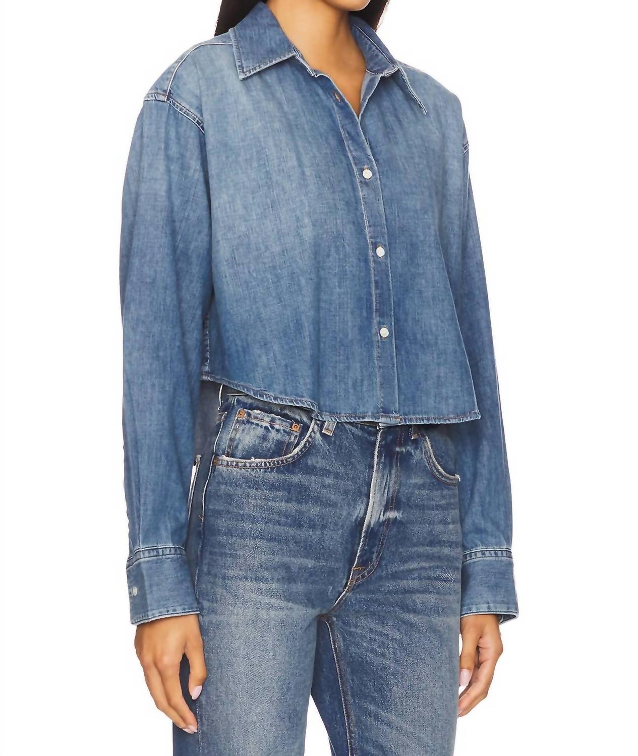 Pair this crop top with your favorite high-waisted jeans or maxi skirt. Elevate your streetwear ensemble with the Ana Cropped Shirt by Citizens of Humanity, perfect for summer getaways. This cropped long sleeve shirt features a pointed collar and boasts a medium indigo Somerset wash that exudes laid-back sophistication. Crafted in Turkey from 100% lightweight Japanese cotton, it offers a breathable natural drape with a solid pattern. Closure comes with a button closure, and you can conveniently machine wash and tumble dry this piece.