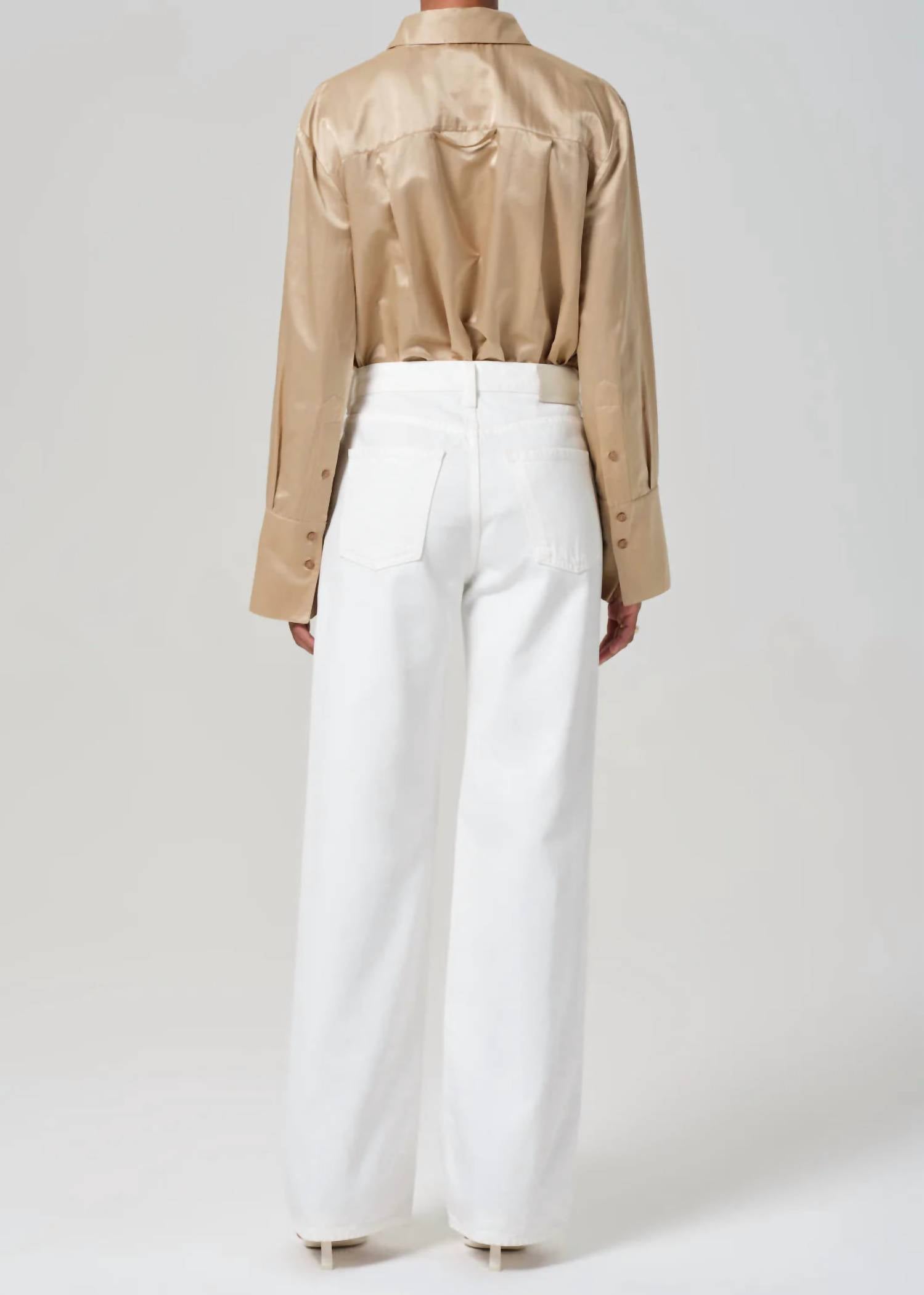 Discover the Annina High Rise Wide Leg Pants by Citizens of Humanity, an effortlessly chic choice in clean off-white. Crafted from a soft blend of 65% Lyocell and 35% Cotton, these pants feature a relaxed fit, designed to sit high on the waist with an ultra-relaxed wide leg and a flattering 11.25" rise. The full-length design includes a 33" inseam and a 20.5" leg opening, finished with a button fly closure, offering a streamlined look for any occasion. Made in Turkey, these trousers are easy to care for, simply machine wash cold inside out and tumble dry low. Model is 5'10" and wears a size 27.