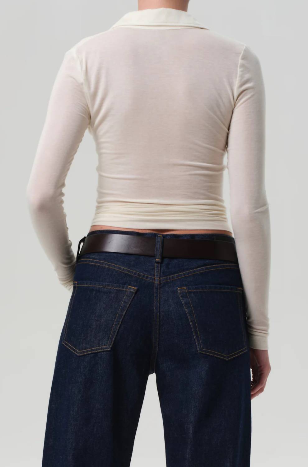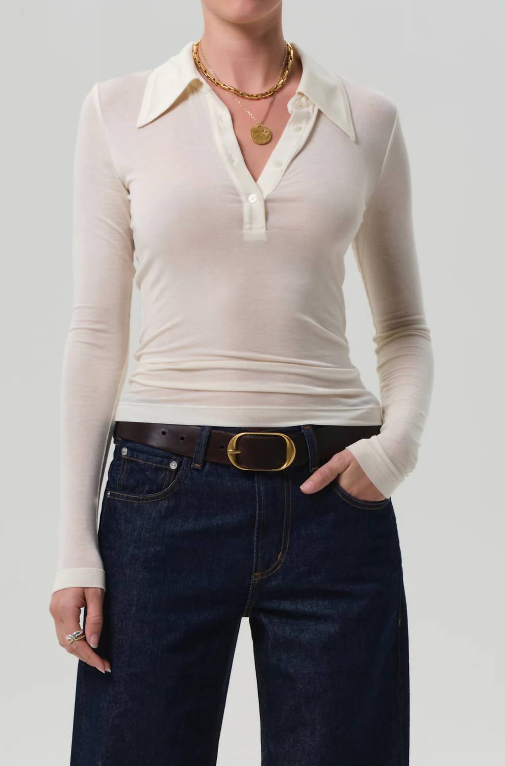 A long sleeve top you can wear with denim, skirts, well... just about anything! Introducing the Shaea Polo by Citizens of Humanity, a chic update on the classic henley, with long sleeves and a pointed collar for a sleek look. Expertly crafted from breathable Lyocell, this women's top in a solid Pashmina hue delivers both comfort and a polished appearance. Care is a breeze with machine wash and tumble dry instructions, ensuring it's travel-ready. Embrace effortless style with a fit that's true to size.