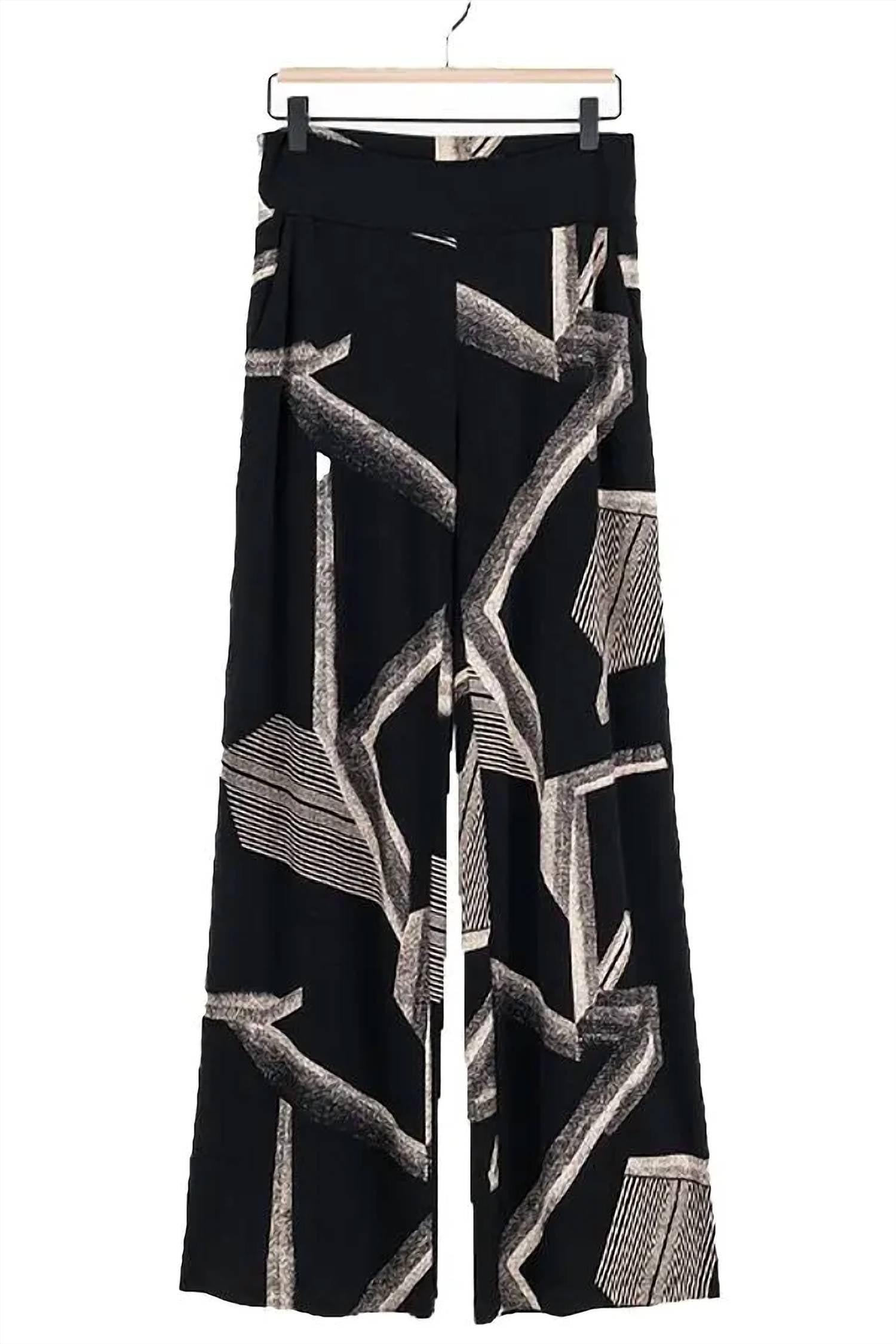 Discover the Jersey Knit Pull-on Pant by Clara Sun Woo, where effortless style meets all-day comfort. Featuring wide legs and a high-rise waist, these pants showcase a striking black and taupe geometric print. The soft, stretch jersey composition of 70% Polyester, 20% Rayon, and 10% Spandex ensures a comfortable fit, while the pull-on closure adds convenience. Designed for practicality and style, machine wash these pants and lay them flat to dry, making them perfect for your spring season wardrobe.