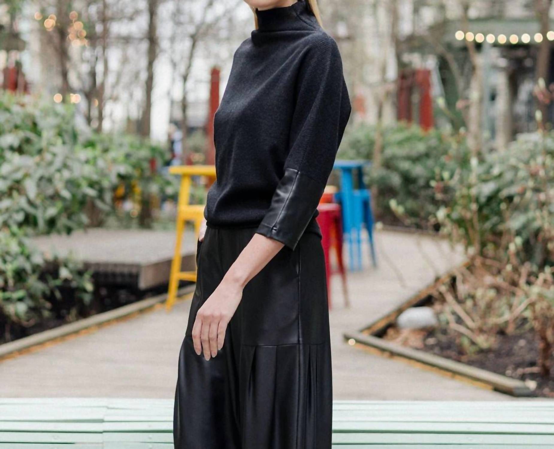 Fit to perfection and effortlessly chic. Elevate your winter wardrobe with the Plush Ribbed Liquid Leather Cuff Sweater Top by CLARA SUNWOO. This sophisticated black sweater features three-quarter length dolman sleeves adorned with liquid leather cuff details for a chic touch. Crafted from a plush ribbed knit that feels as soft as cashmere, it combines warmth and breathability, perfect for layering. Its loose, modern silhouette is a testament to quiet luxury and is ideal for those who value both style and comfort.