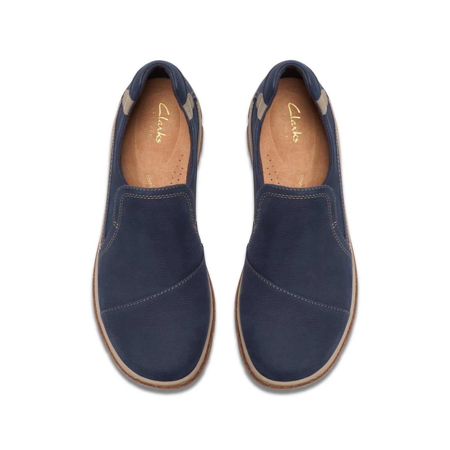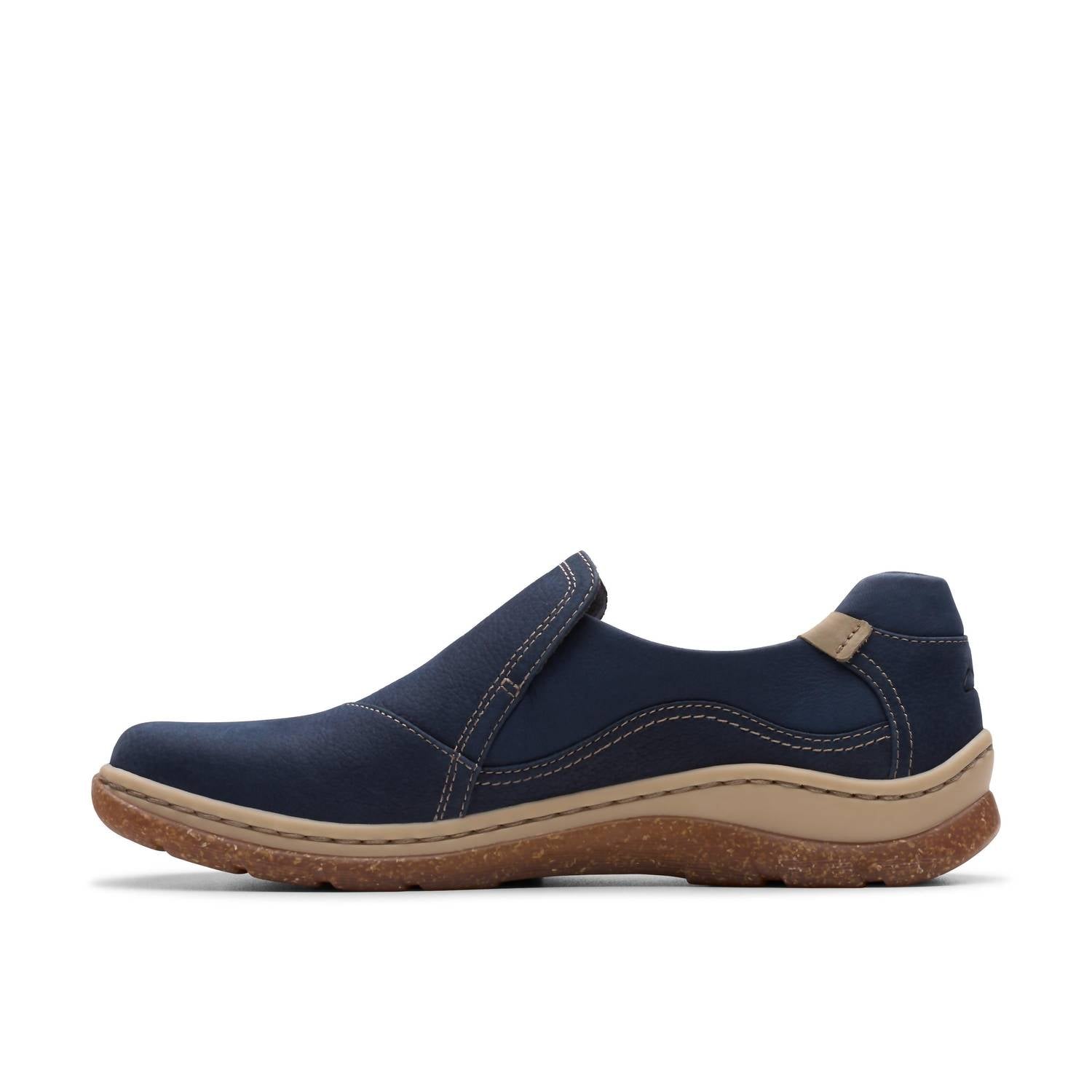 A classic loafer that is both comfortable and polished. Experience the effortless style and comfort of the Women's Orlene Slip-on Shoe by Clarks, an essential flat in versatile navy. Crafted from premium black leather, this minimalist shoe features a round toe and a molded contour cushion footbed for unrivaled comfort. It's finished with a rice-husk-flecked, two-layer TPR sole that's lightweight and impact-absorbing, ideal for travel or casual spring outings. Designed with side stitch detailing for added durability, this shoe offers a crafted, casual feel.