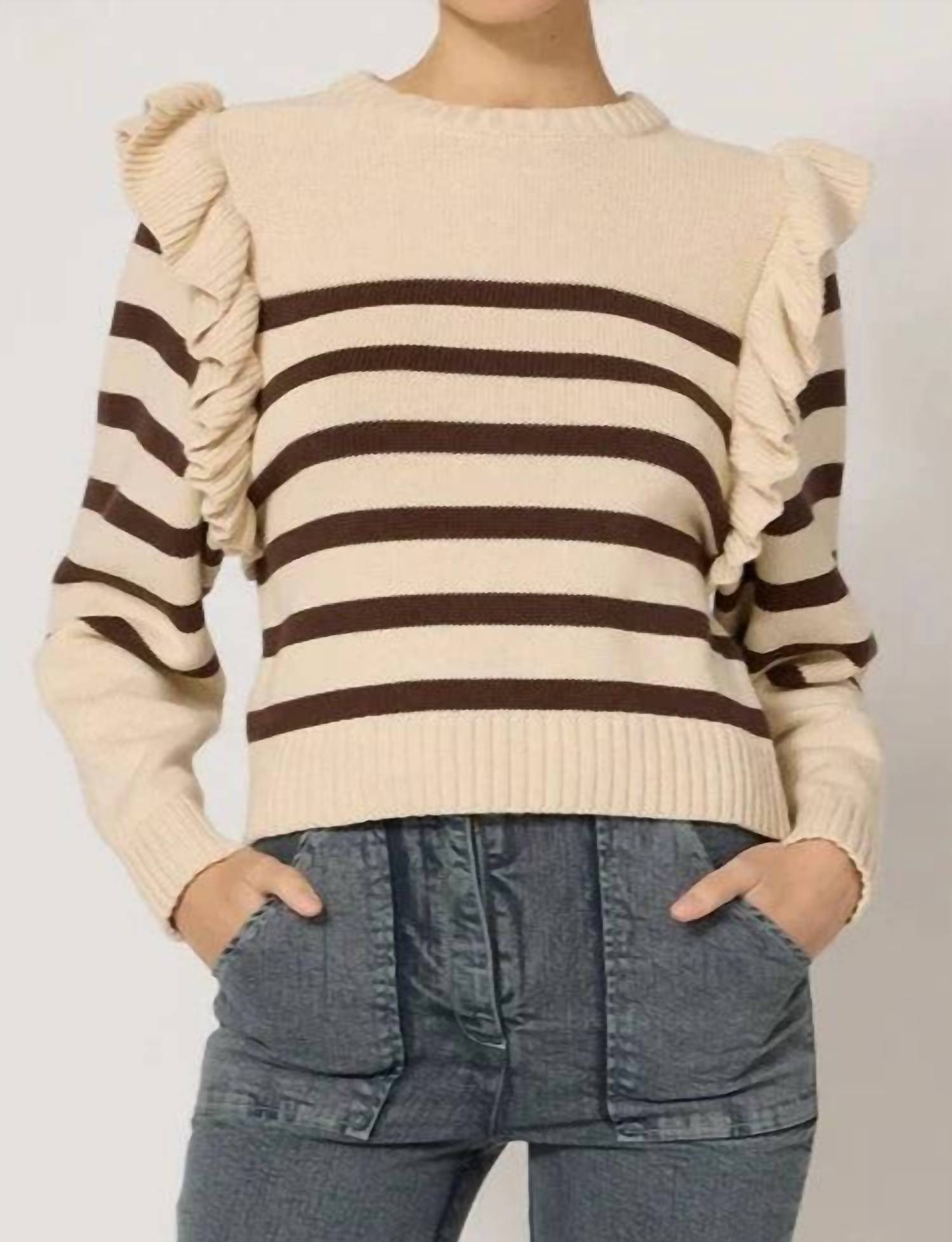 A classic fit that works just as good buttoned as it does left open. The Blair Ruffled Sweater by Cleobella is an embodiment of luxury and sustainability, perfect for elevating your fall wardrobe. With long sleeves and crafted from 100% organic cotton, this cardigan showcases a striking stripe pattern and unique ruffle detail at the shoulders. Closure: V-neck with 3-button closure down the front. Care: Hand cold wash and lay flat to dry or opt for dry cleaning for longevity.
