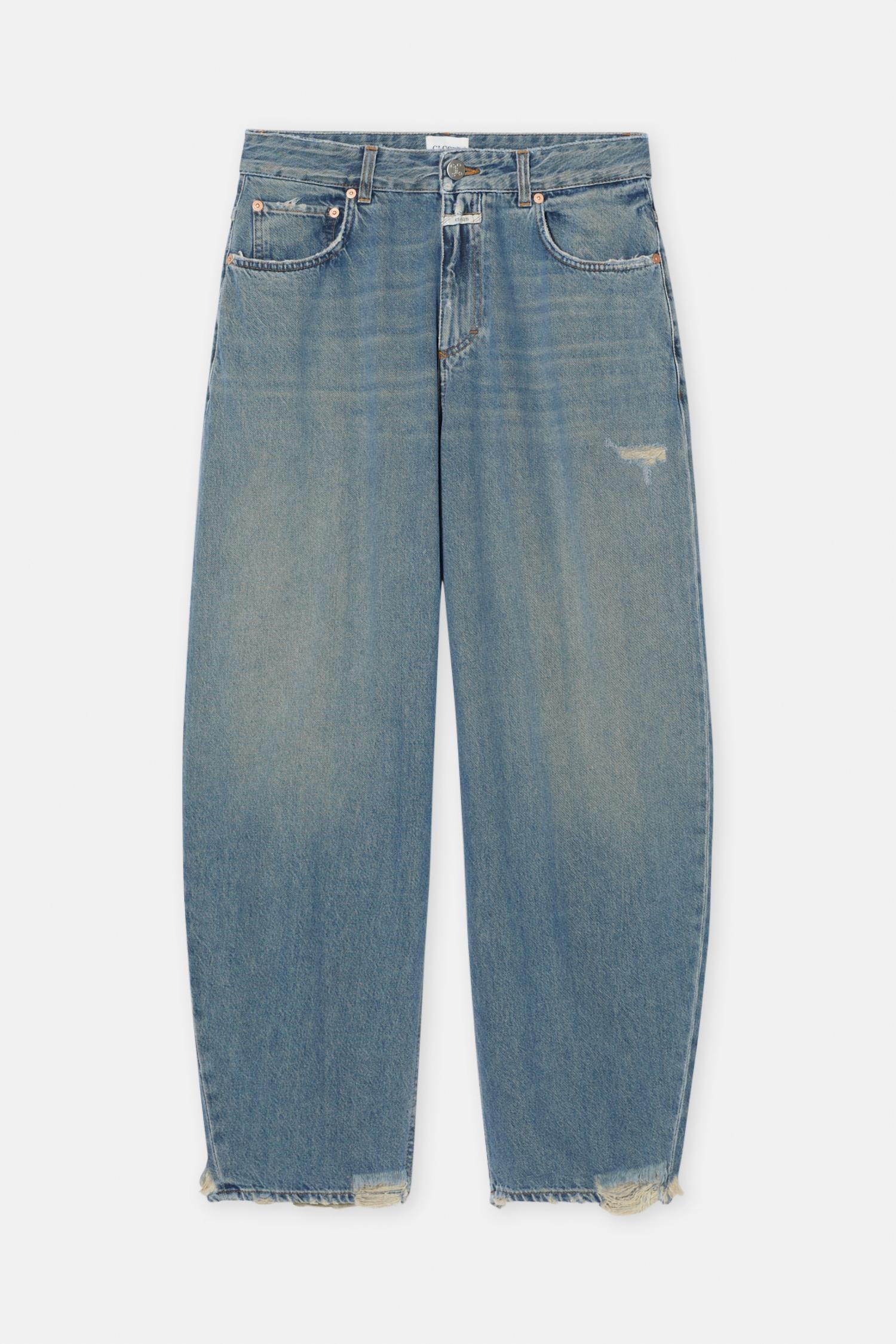 High-waist is here to stay and we especially love this style. Discover the Jazzie Barrel Jeans by CLOSED, a perfect choice for your streetwear collection in a Distressed Blue hue. These women's jeans feature a high rise and wide-leg design, crafted from a sustainable cotton blend of 80% cotton and 20% recycled cotton with eco-friendly dyes. These jeans boast a button closure, classic five pockets, and a stylish salt 'n pepper wash with distressed, patched holes for a vintage flair. Care instructions suggest machine washing and tumble drying.
