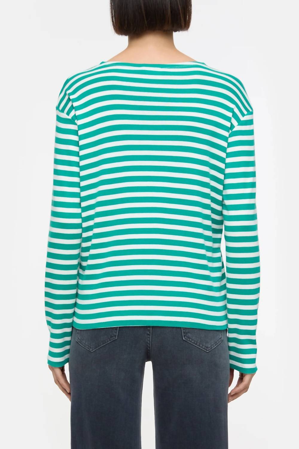 A long sleeve top you can wear with denim, skirts, well... just about anything! Embrace elegance with the Long Sleeve Striped Shirt by CLOSED, presented in a serene Meadow Green. Crafted from a soft cotton-modal blend, this piece features a finely ribbed jersey material that offers both comfort and style. With long sleeves and a classic crewneck complemented by woven stripes and dropped shoulders, it embodies sophisticated casualwear. Closure is pull-on; care is simple with machine wash and tumble dry instructions.