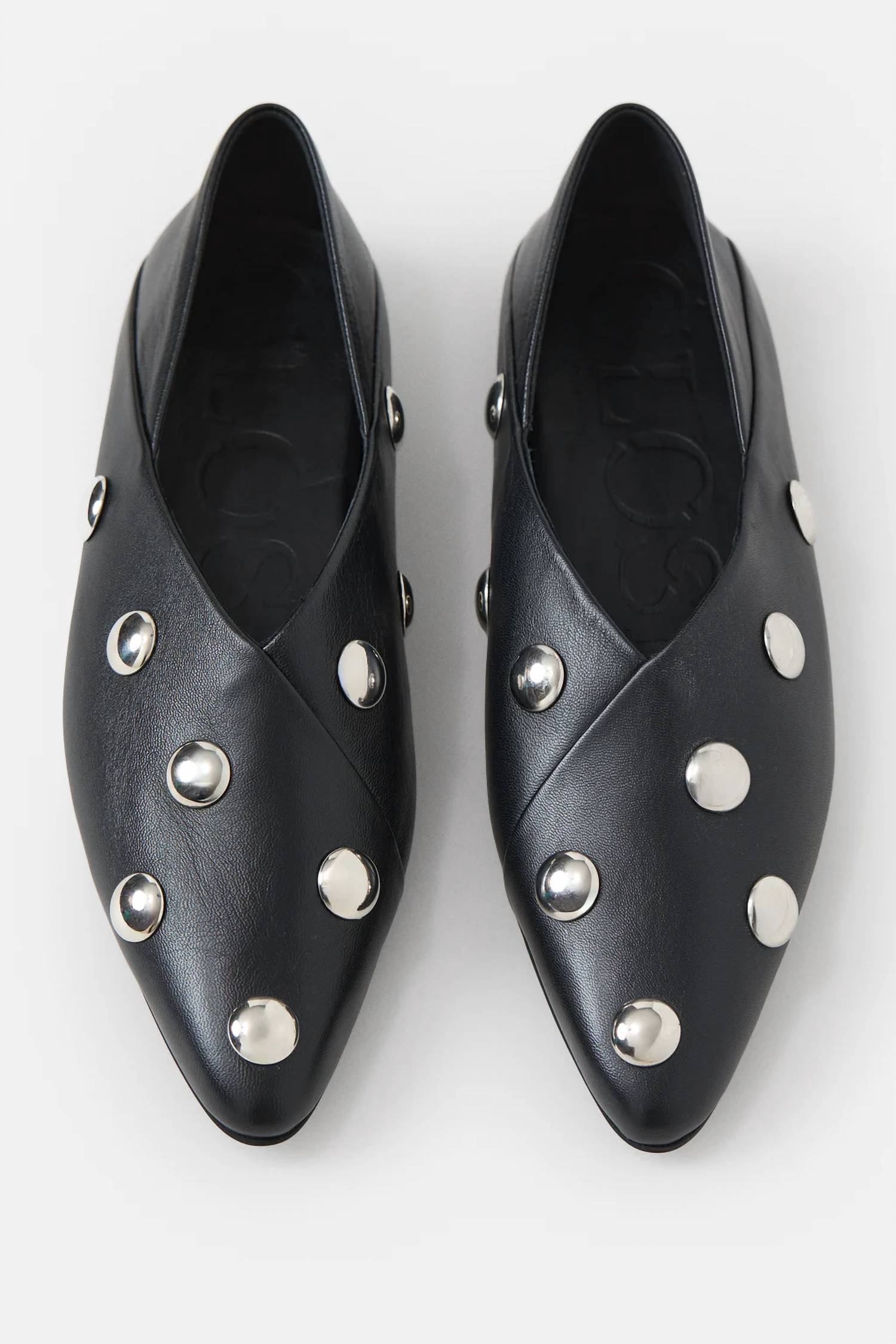 A preppy yet feminine take on the classic loafer. Introducing the Women's Ballerina Flat Shoes by CLOSED, a sophisticated choice for both workwear and special occasions like engagements or Easter. Crafted from 100% cowhide leather, these black flats feature a striking combination of high-quality leather, silver studs, and diagonal stitching. Designed in Italy, they boast a soft interior and a leather sole with a hand-stitched edge, complete with a pointed toe for a sleek profile. Ideal for the spring season, these flat-heeled ballerinas are the epitome of comfortable elegance.