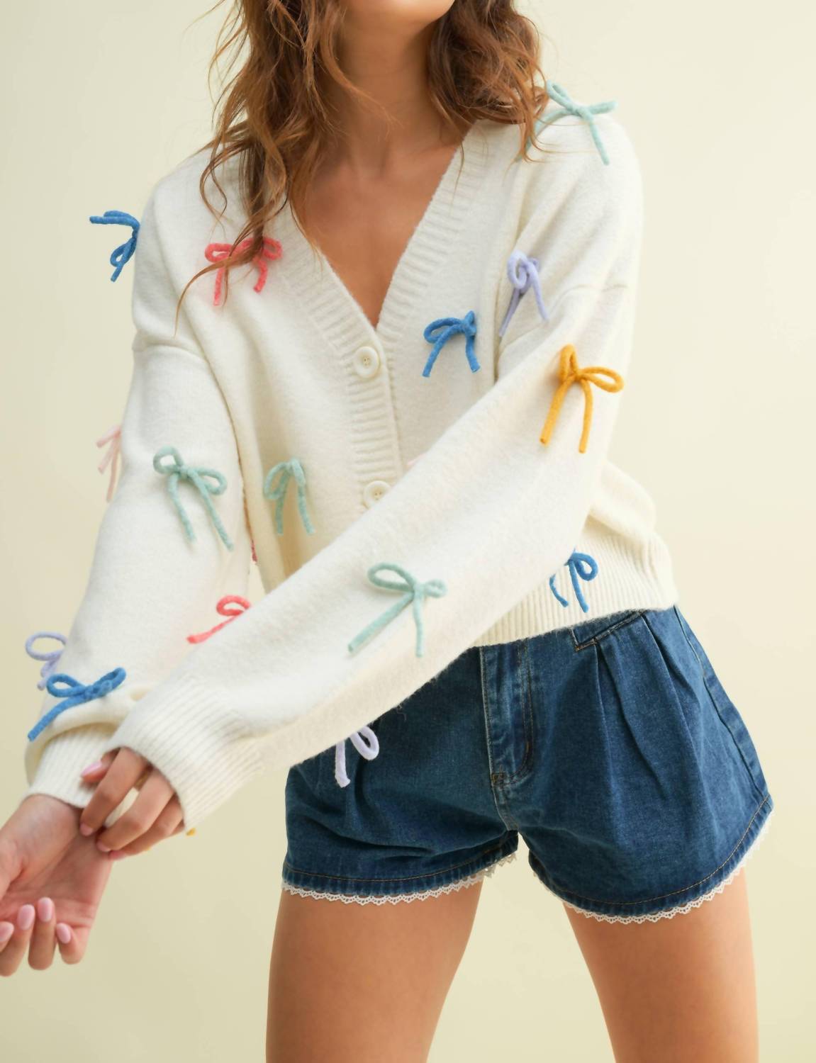 Wear this v-neck sweater with your favorite denim for the perfect fall look. Introducing the Colorful Bow Cardigan by Cloud Ten, a chic addition to your wardrobe in an elegant ivory shade. This long sleeve V-neck cardigan is crafted from a luxurious blend of 47% Polyester, 35% Acrylic, 15% Nylon, and 3% Spandex, featuring a stylish patterned knit with playful contrast bows. With a slightly cropped fit and relaxed sleeves, it exudes a relaxed yet polished vibe for any occasion. Closure: Button closure. Care: Dry clean to maintain its charm and allure through every season.