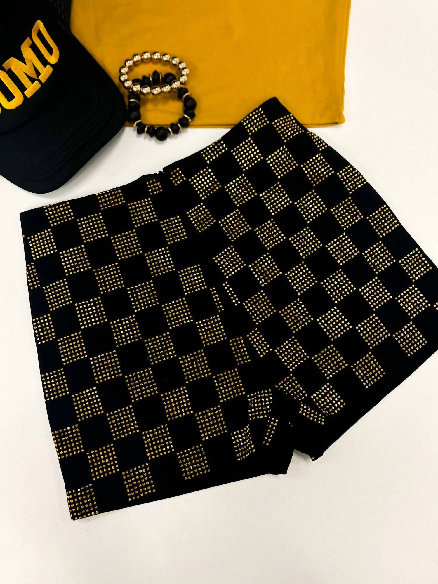 Fit to perfection, we love these high-waist shorts and you will too. Introducing the Women's Championship Check Shorts by Cloud Ten, perfect for those who love a bold, statement-making style. Featuring a high-rise fit and a pull-on closure, these shorts are covered in dazzling rhinestone studding with a checkerboard-inspired shimmer, ensuring you stand out. Crafted from a stretchy blend of 80% Rayon, 15% Nylon, and 5% Spandex, they provide a comfortable yet eye-catching fit. Ideal for summer outings, these plaid & check shorts offer a chic look for game days, concerts, or beach days.