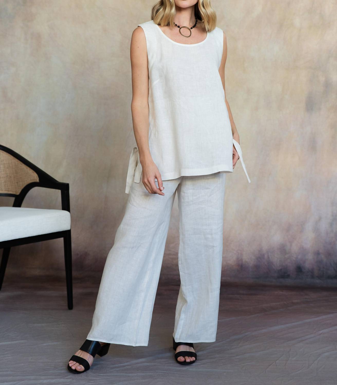 A versatile blouse that works from desk to dinner! Discover the Brina Linen Sleeveless Round Neck Top by Cobblestone Living, an embodiment of breezy minimalism in washed grey. Made from 100% Italian Linen, this sleeveless top with a scoopneck offers a relaxed fit, perfect for warm spring days or holiday parties. Enjoy the easy pull-on closure and adjustable ties at the open sides. Crafted in Italy for premium quality and style. Care: Hand wash cold and lay flat to dry.