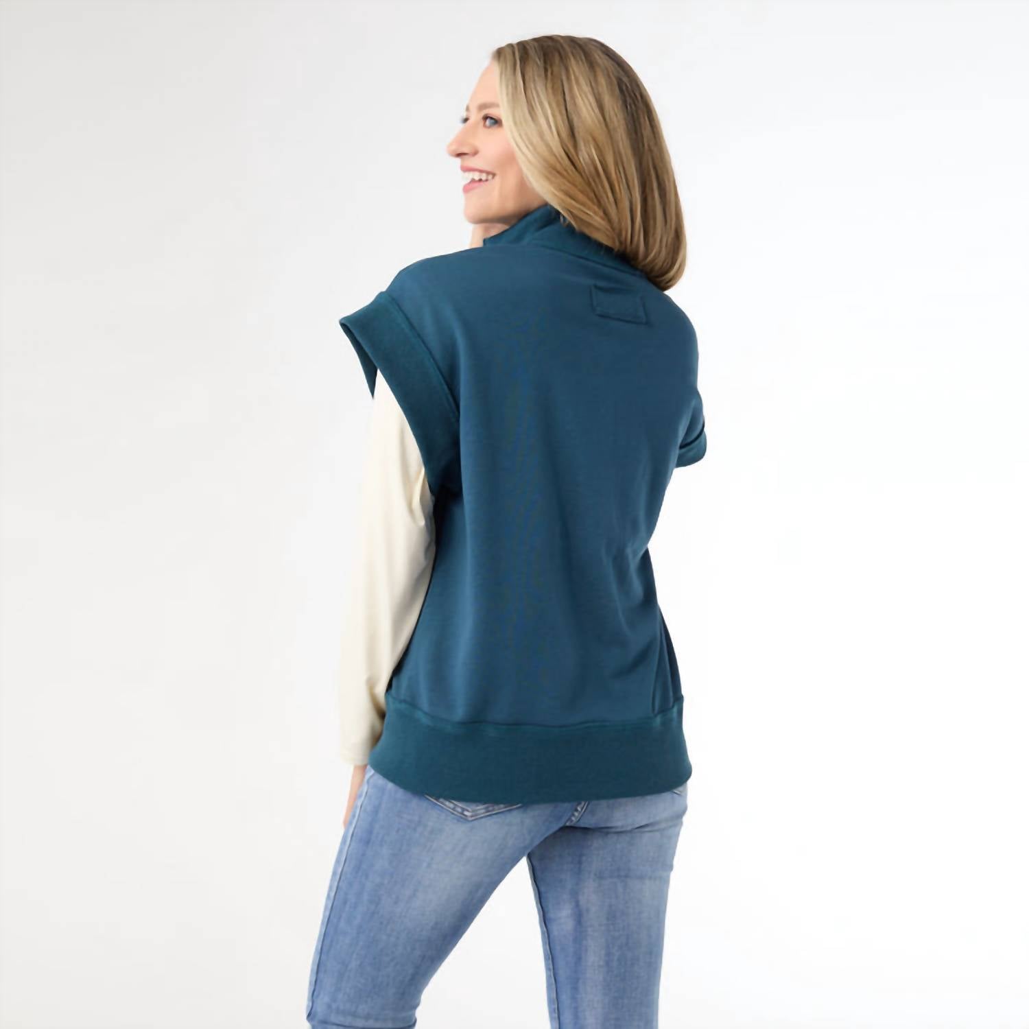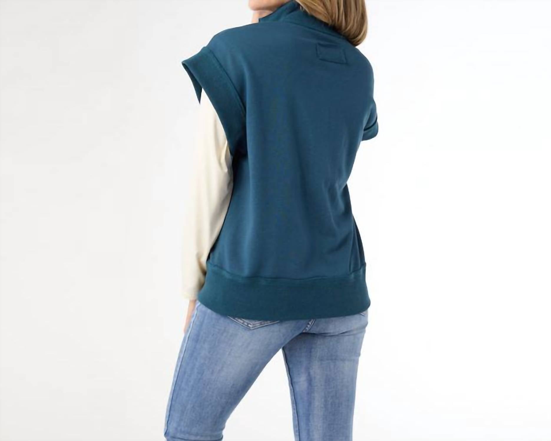 Throw this vest over an all black outfit for a perfectly polished look. Elevate your fall wardrobe with the Kaitlyn Zipper Front Vest by COCO + CARMEN, a perfect fusion of trendy style and practicality in deep teal. This sleeveless polyester vest features a convenient zip closure, making it an easy layering piece for back-to-school streetwear outfits. The mockneck design adds a touch of sophistication while the functional pockets enhance utility. Embrace the solid pattern for versatile styling options, ideal for Thanksgiving gatherings and beyond.