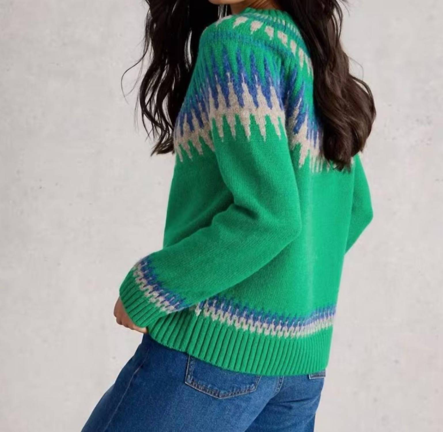 Stay warm and stylish in this versatile and effortlessly cool knitwear staple. Wear it alone or layered, it's the perfect sweater for the season and you'll wish you had it in every color. Embrace timeless elegance with the Fifi Fairisle Crew Sweater by Colorush, an ideal choice for cool spring days. Designed with long sleeves and a pull-on closure for ease and comfort, this sweater is crafted from 100% luxurious cashmere. The vibrant patterned Green Multi color adds a touch of sophistication to your wardrobe. Ideal for housewarming occasions, this women’s sweater requires dry cleaning to maintain its pristine quality.