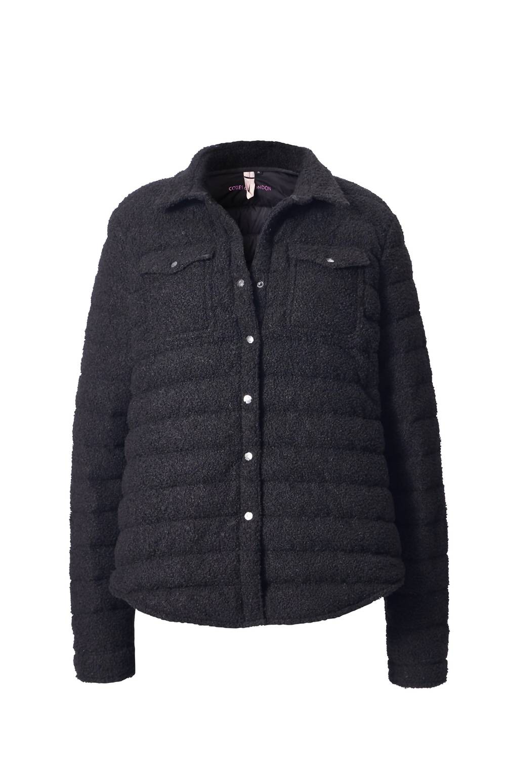 Cute, casual, and comfortable. This jacket is a must have. Introducing the Harrow Micro Sherpa Jacket by Cotes of London, an elegant black essential for your fall wardrobe. This women's jacket features long sleeves and is crafted from 100% polyester micro sherpa with a lightweight 90% goose down filling, offering a soft, ultra-light layer perfect for travel. Thoughtfully designed with dual chest pockets, a hidden arm pocket, and a large inside pocket with a built-in bag for convenience. Closure: Button closure. Care: Machine wash. Ideal for a minimalist aesthetic, complete with a classic collar.