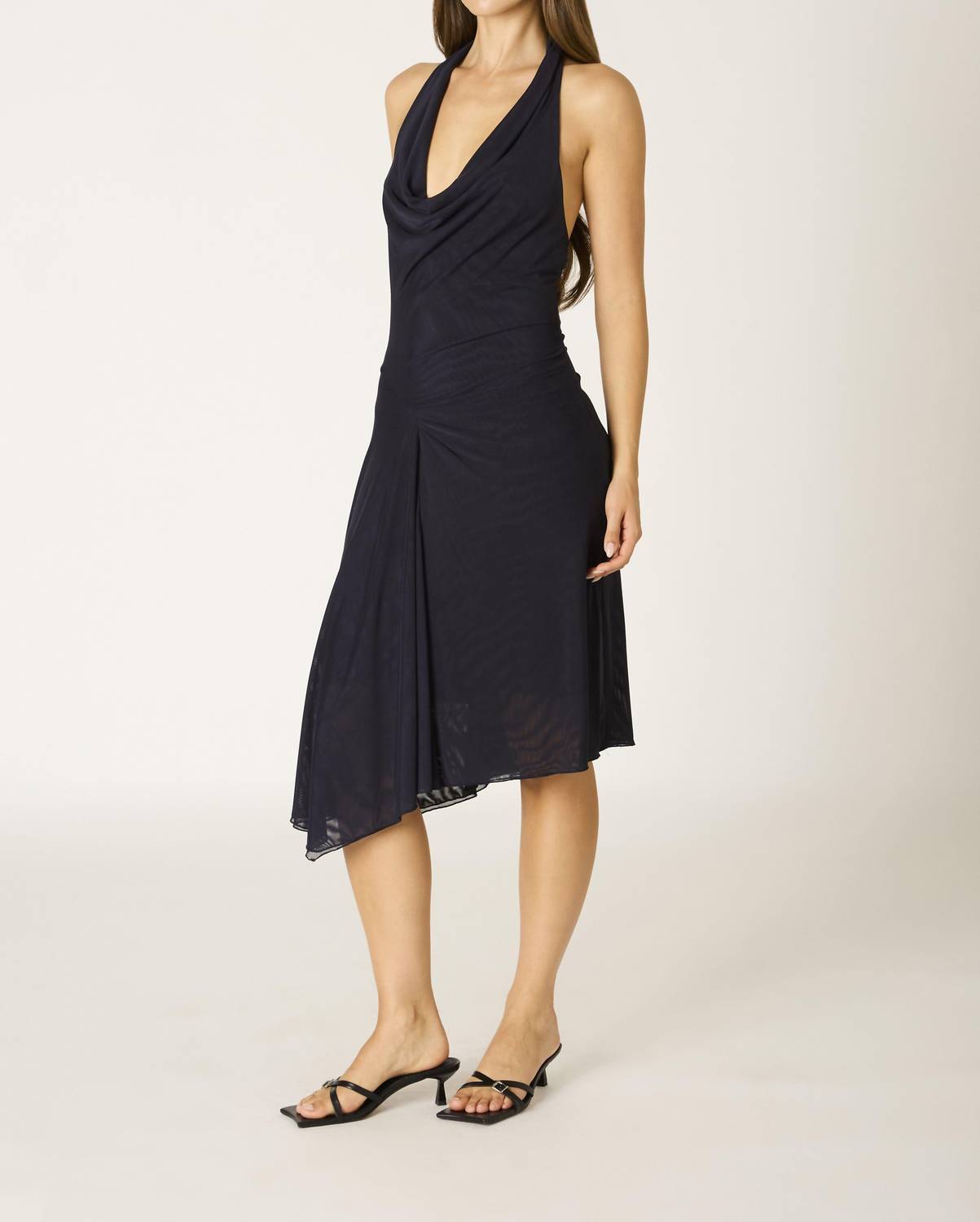 A midi dress so versatile, your options for wearing it are endless. Step into elegance with the Jocelyn Midi Dress by Cotton Candy LA, a sleek addition to your spring wardrobe crafted for fashionable dinner parties. This black sleeveless dress showcases a stunning draped cowl halter neckline, a fitted ruched bodice, and an alluring open back for a striking silhouette. Made from a blend of 94% polyester and 6% spandex, it features a bodycon design with an asymmetrical hemline. Closure: Pull on. Perfect for exuding quiet luxury in solid pattern simplicity.