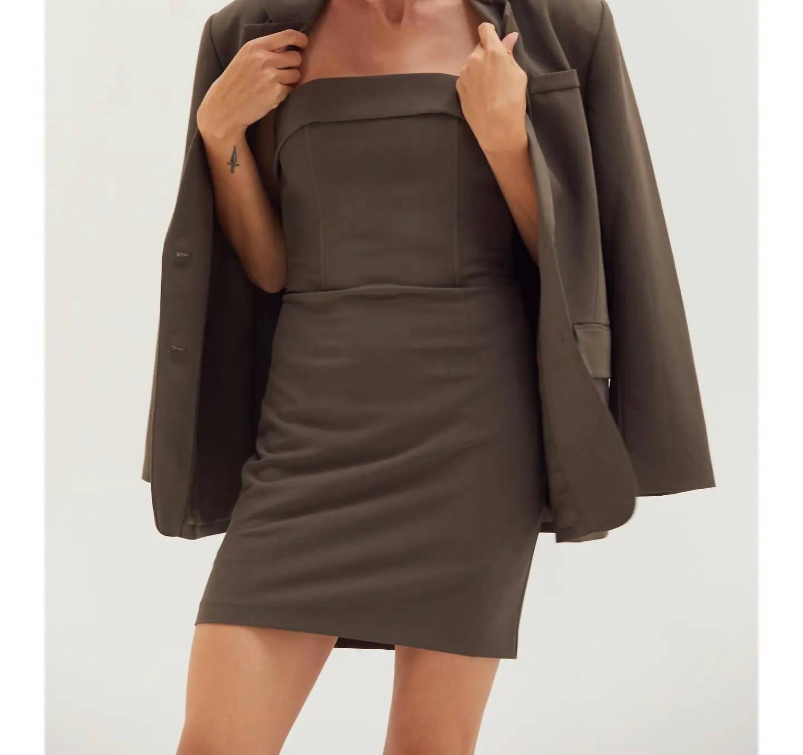 The perfect mini dress for those warmer months. Introducing the Gia Strapless Mini Dress by CRESCENT, crafted for the perfect holiday party look. This chic, brown grey mini dress features a strapless tube style with a straight neckline and fold-over detail for a sleek, minimalist aesthetic. It includes boning on the front chest and sides for added shaping and support, along with a discreet back zip closure. Made from a durable blend of 78% Polyester, 18% Rayon, and 4% Spandex, it promises comfort and elegance. Imported and fully lined, this bodycon silhouette requires hand washing to maintain its crisp appearance. Style No. CD8623-1-A.
