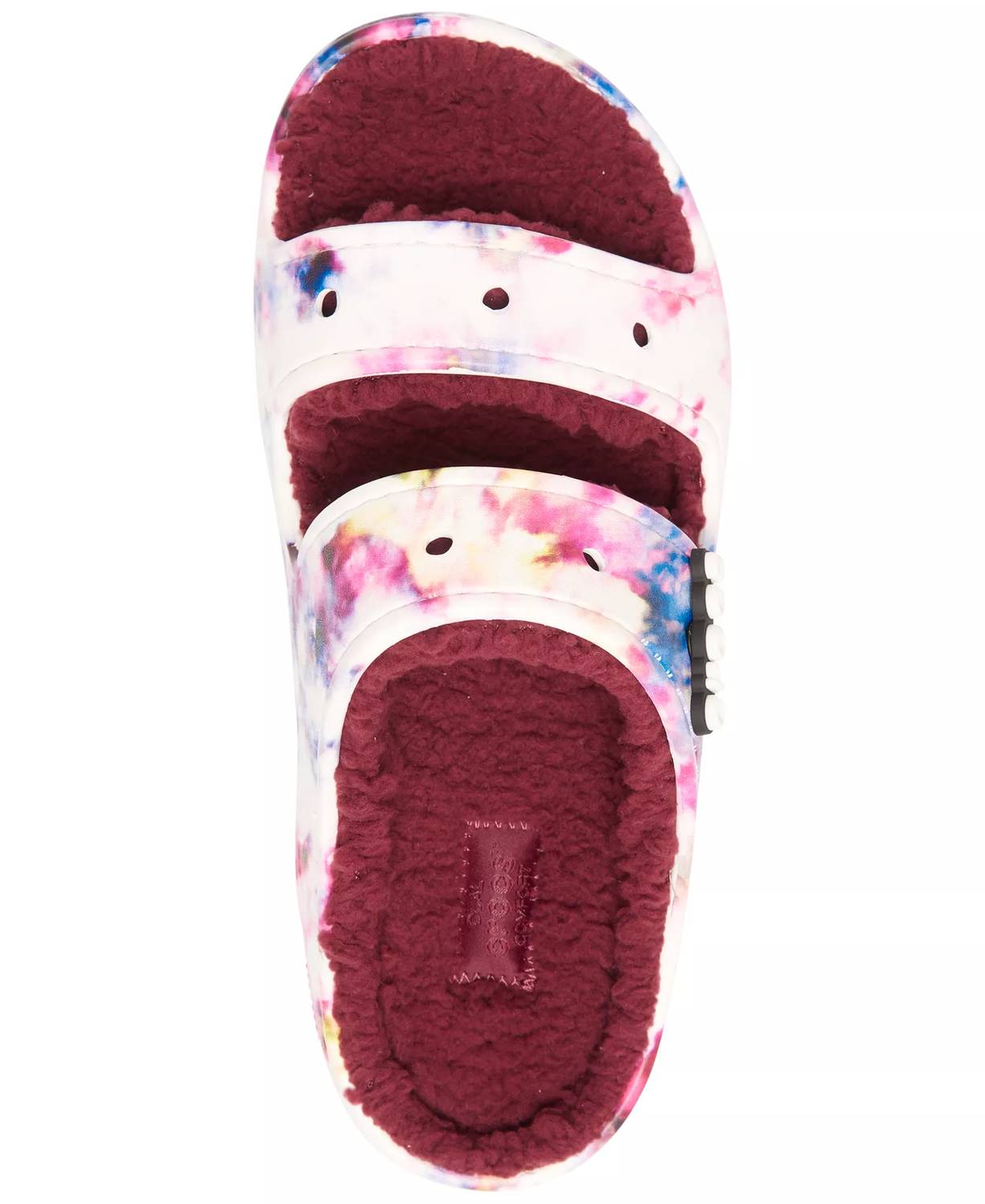 Slip into these, we promise you won't regret it. Step into comfort and style with the Unisex Classic Cozzzy Sandals by Crocs, in a vibrant Garnet Multi. These sandals feature a two-strap upper design with a warm, fuzzy liner, perfect for those summer beach days. The slip-on style makes for easy wear, coupled with height-boosted platform heels for a trendy look. Made from Croslite foam, these sandals provide a lightweight feel and easy cleaning. Synthetic and textile uppers with a rubber sole ensure durability. Customizable with Jibbitz charms (sold separately). Care: Wipe clean. Imported.