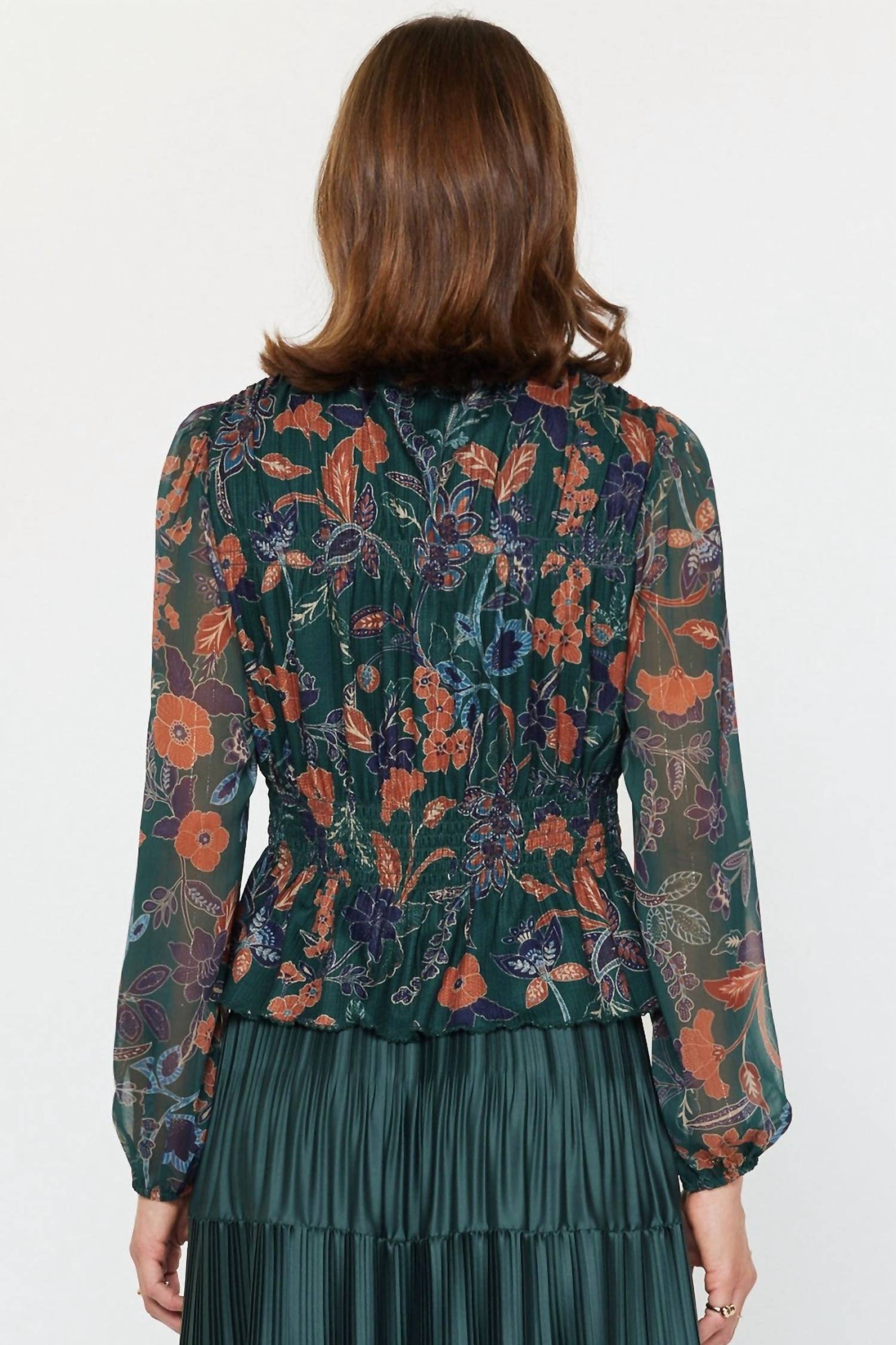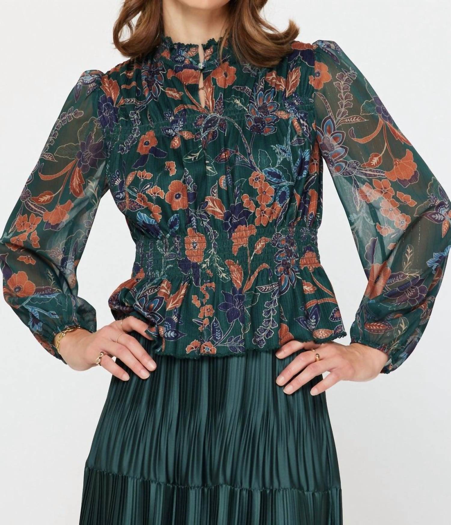 A versatile blouse that works from desk to dinner! Introducing the Julissa Top by Current Air, a vintage-inspired blouse perfect for adding elegance to both work and weekend ensembles. This dark green floral print top features long sleeves with elastic cuffs for comfort, a ruffled mock neckline with a keyhole detail, a smocked waist, and a chic peplum hemline. Crafted from 96% Polyester and 4% Spandex, it promises a flattering fit while maintaining ease. Made in the USA, this top is finished with a button closure and is ideal for dinner parties or minimalist spring trends.